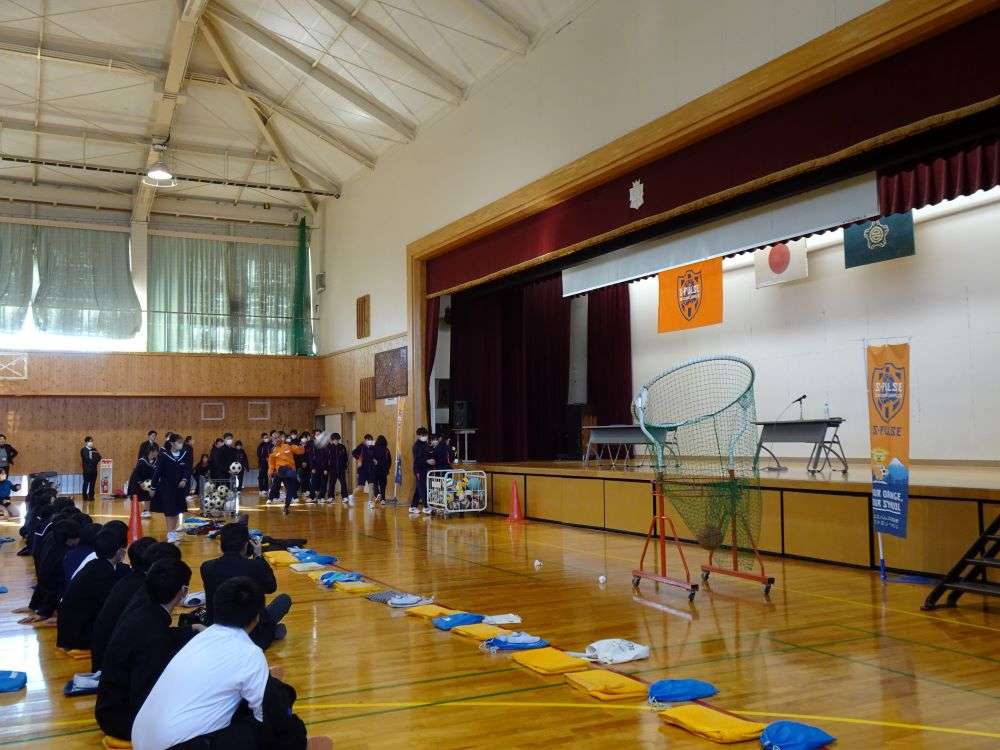 生徒の皆さんとの実技対決では、サッカー、ソフトボール、バドミントン、バレーボールなど各部活の部長さんと球入れ対決を行いました。吉田選手はサッカーボールをキックで、各部長さんはそれぞれの種目でゴールを狙います。全校生徒の応援で盛り上がる中、勝負は見事13対8で吉田選手の勝利!そして実技で活躍した生徒さんと、じゃんけん大会で勝ち抜いた生徒さんにサイン入りユニフォームやスパイクをプレゼントしました。