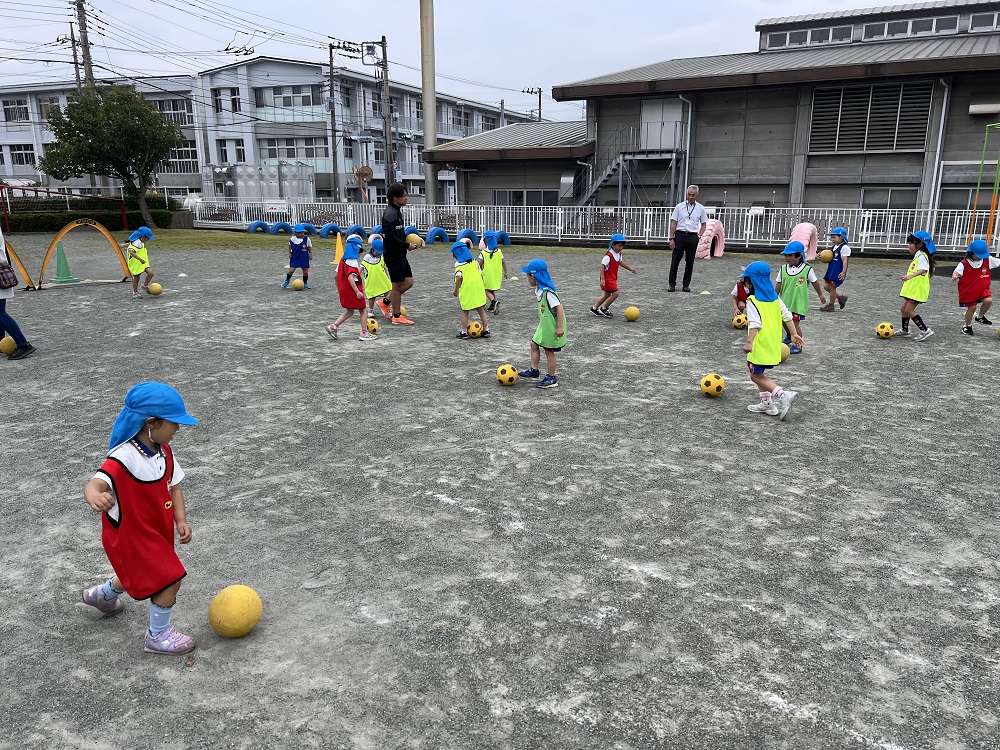 天気が心配されましたが問題なく、蒸し暑い中、全員元気よく頑張りました。転んでも立ち上がり、ボールを追いかける姿が多く見られました。