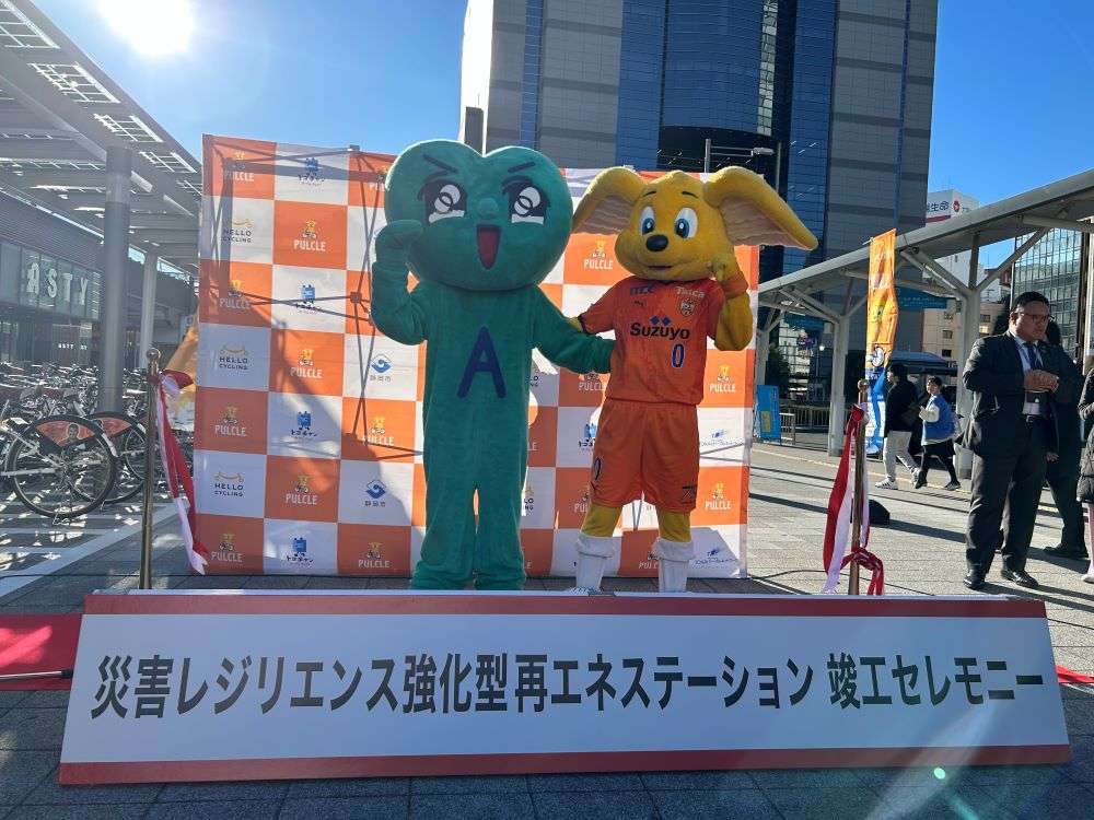 またイベント後には、『PULCLE 災害レジリエンス強化型再エネステーション竣工セレモニー』にも参加しました。静岡駅前北口広場のPULCLEステーションは、発電+蓄電+サイネージを実装した「災害レジリエンス強化型 再エネステーション」としてリニューアルしました。当ステーションで発電した電力は、PULCLEの車載電池への充電とサイネージの稼働に利用するとともに、余剰電力は蓄電池に備蓄し夜間の電力源として利用されます。災害時には充電ポートを解放し、防災拠点としての活用も予定されています。