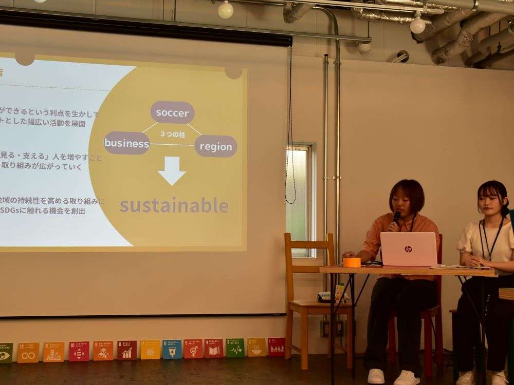 その中で高野さん、平井さんは「市民クラブならではの地域貢献、SDGs活動に取り組み、市民との関係の深さや官民連携が幅広い活動に繋がっている。」「活動の参加者としてだけでなく、主体性を育みアウトプットまでを行えるよう、持続性を生み出す仕組みづくりを行っていた。」「エスパルスの知名度を活かしつつ、市民と同じ目線でSDGsに取り組む姿勢を感じた。」と発表してくれました。