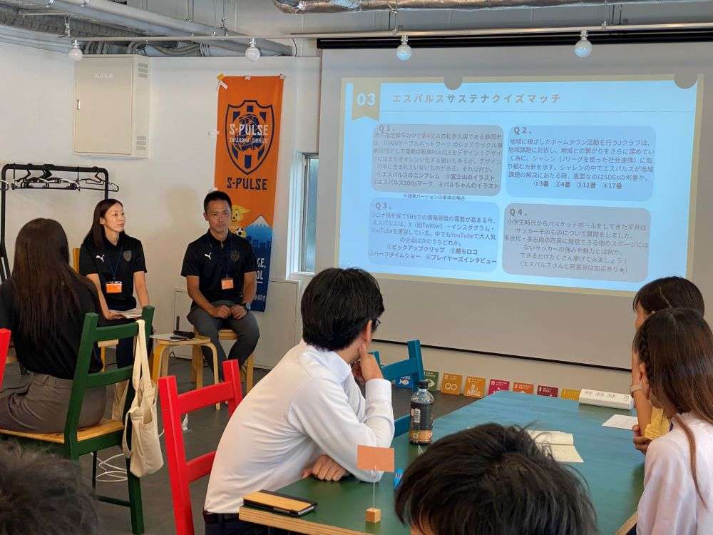 座談会では、『STRONG WILLで挑む!地域の未来の開拓者「エスパルス」のSDGsって?』をテーマに、クラブが事業紹介を行い、学生レポーターが取材・活動報告や、オリジナル企画のサステナクイズマッチをチーム戦で行いクラブのSDGs活動を紹介しました。