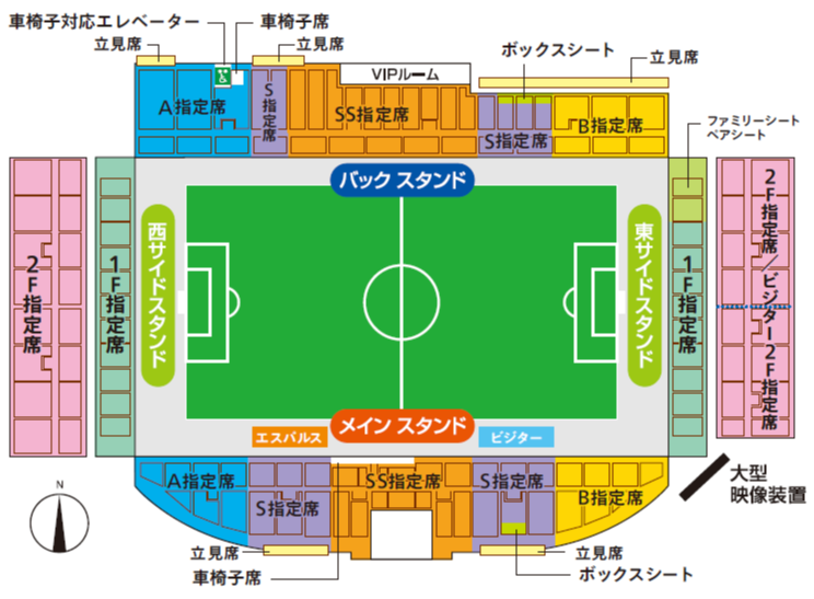 ・東サイドスタンド2Fには「ビジター2F指定席」が設置されます。席数は試合ごとに変動します。一部の試合では、東サイドスタンド全てがビジター2F指定席となる可能性がございます。