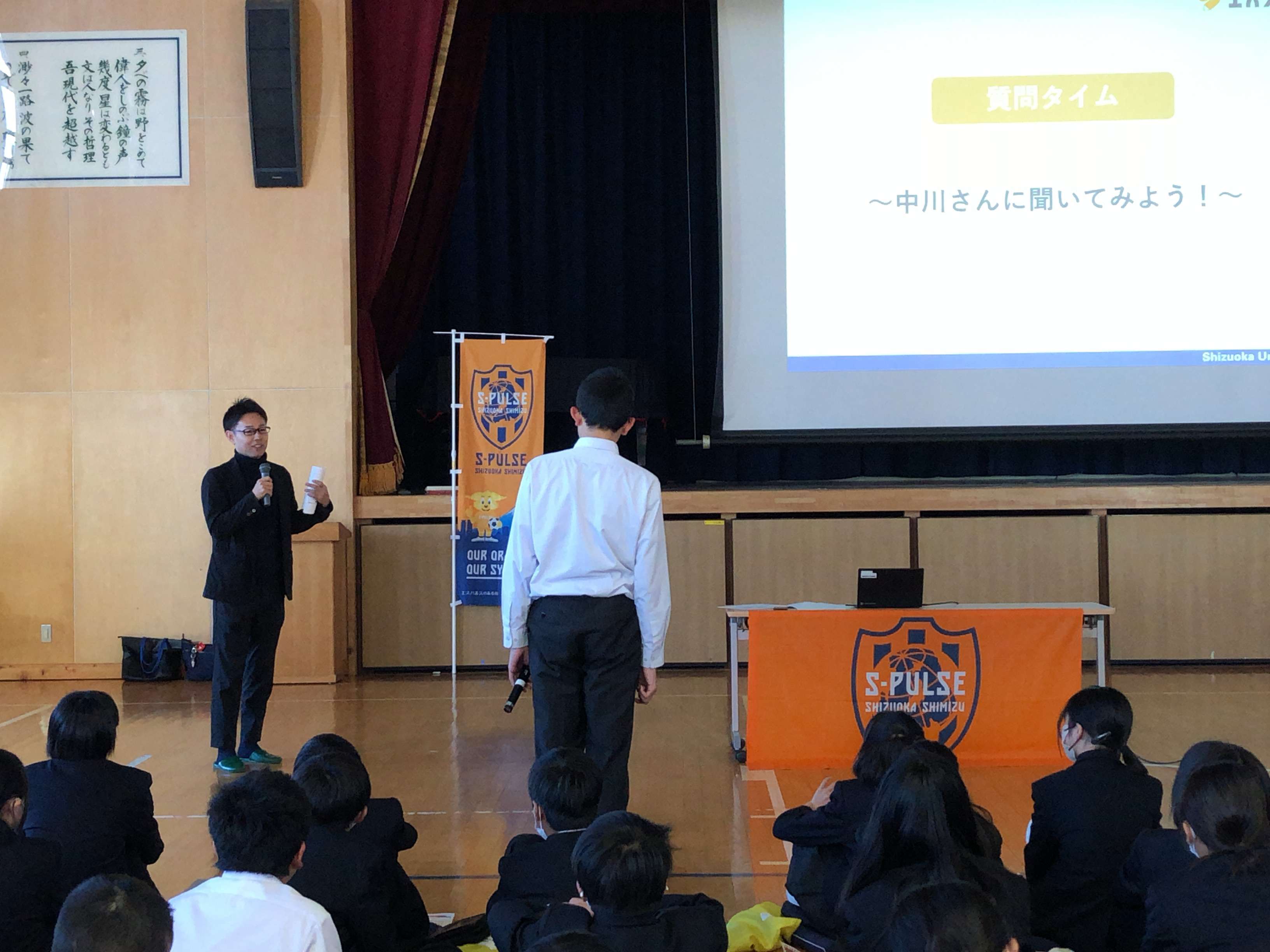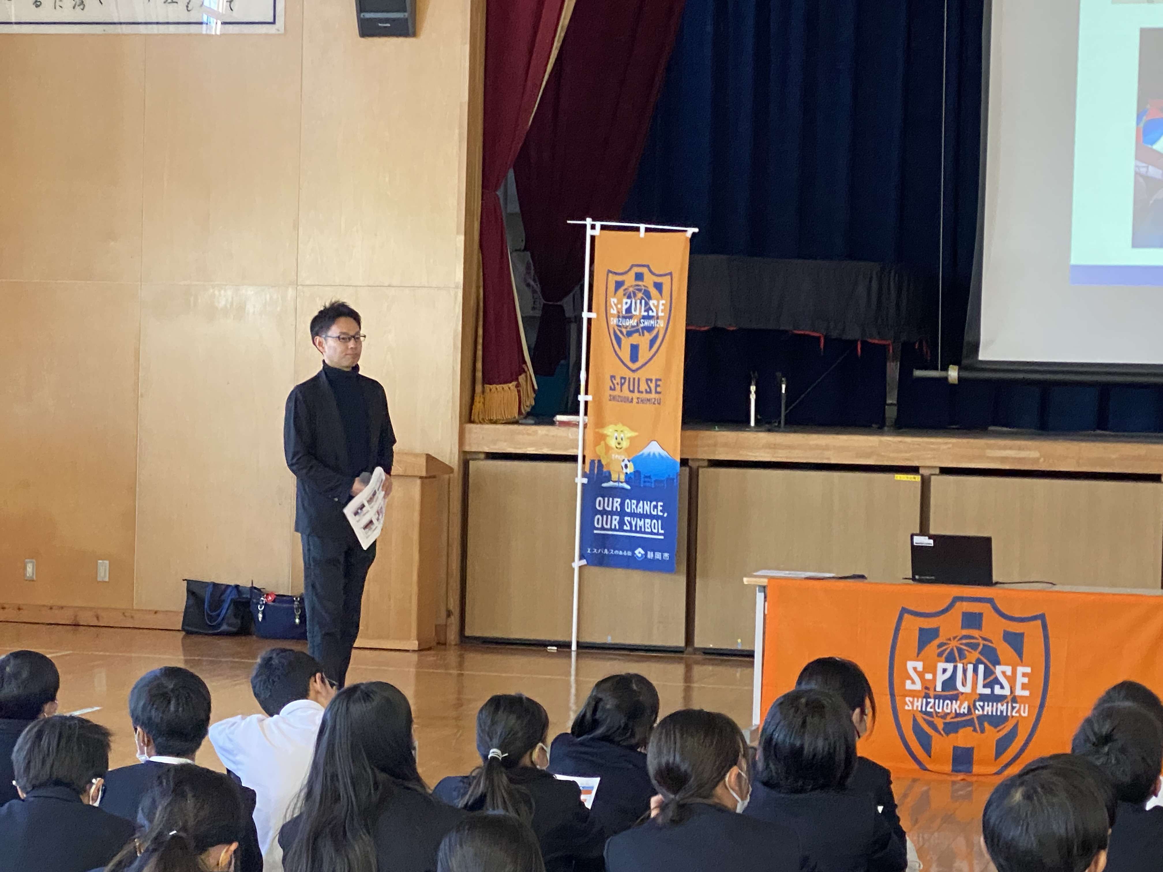 まずは「サッカーやエスパルスを通した地域(会社・市民)との関わりを考えよう」というテーマでエスパルスとパートナー企業、地域とのつながりを考えました。そしてフジ物産の中川文孝さんをゲスト講師に迎え、「大人になって仕事をする時に必要なチカラ」や「地元で働くこと」について学びました。