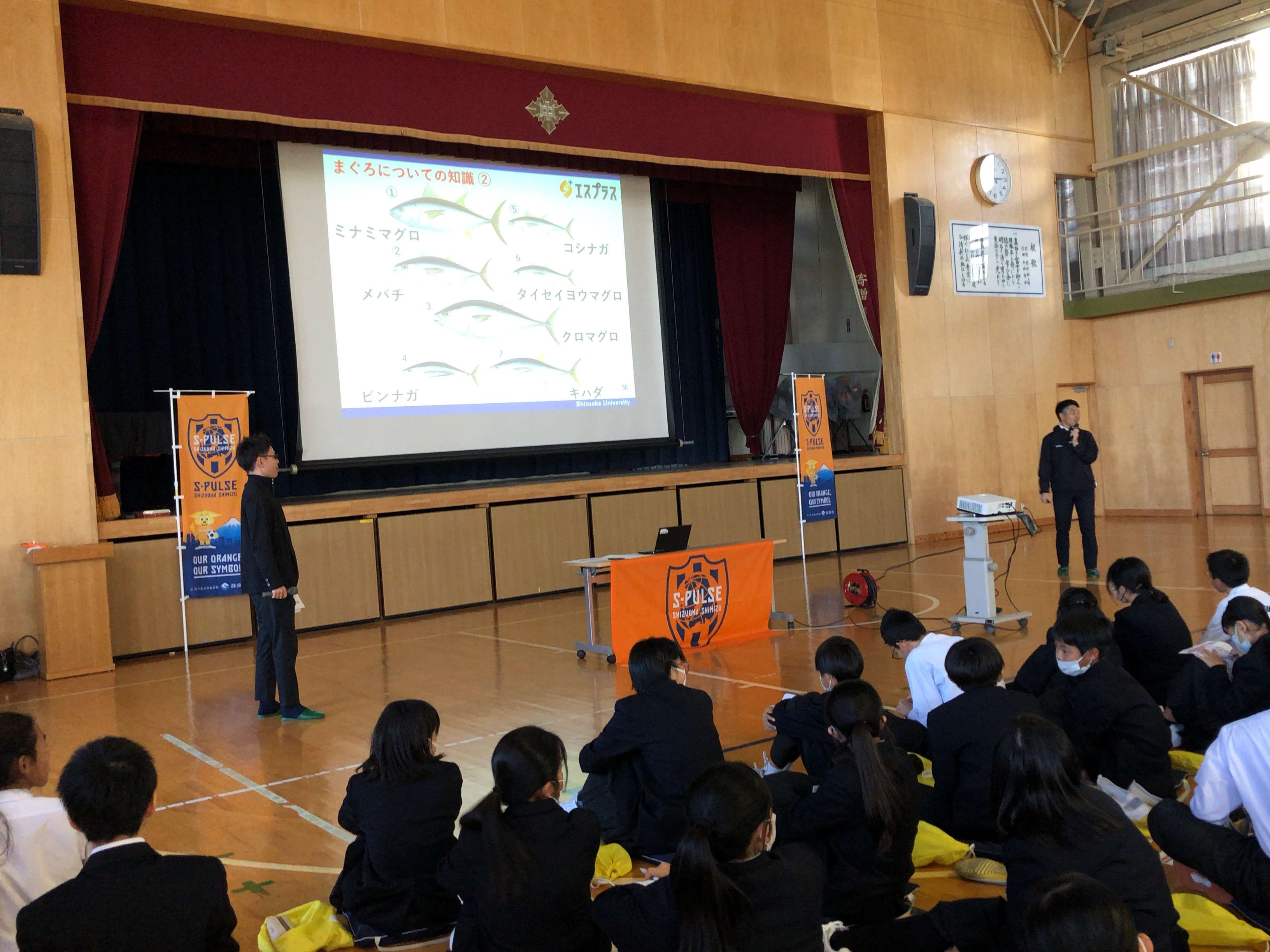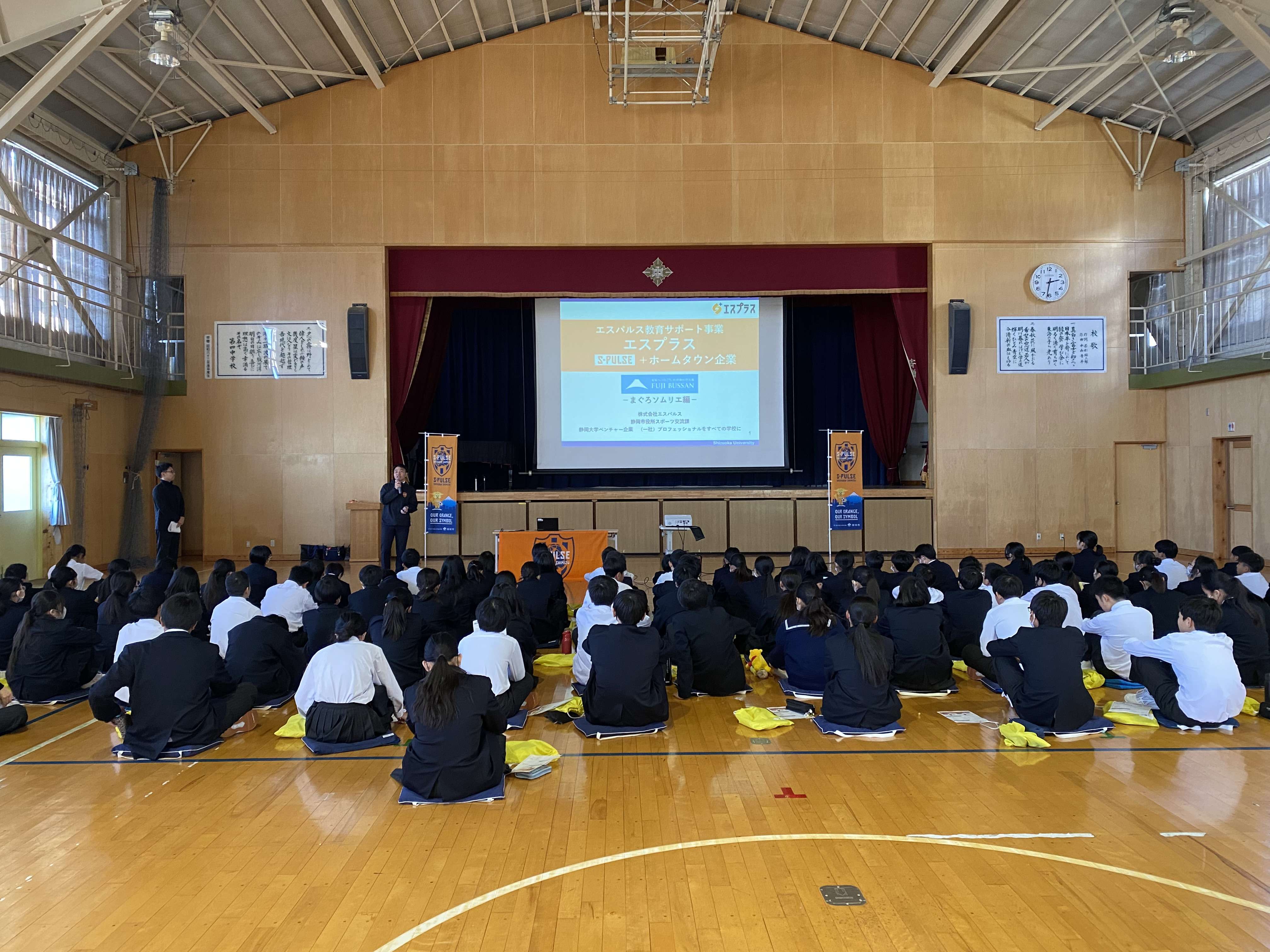 1/23(火) 静岡市立清水第四中学校にて、クラブパートナーのフジ物産株式会社にご協力いただき『エスプラス』「地域貢献や社会に出て必要なチカラを考えるキャリア教育授業 ~まぐろソムリエ編~」を実施しました。