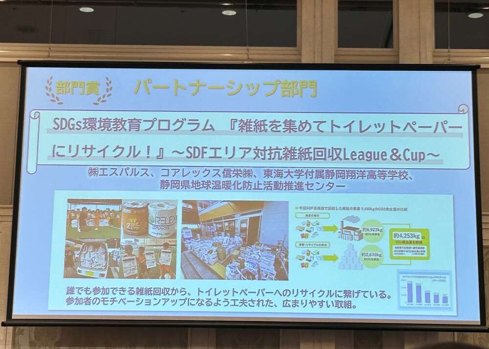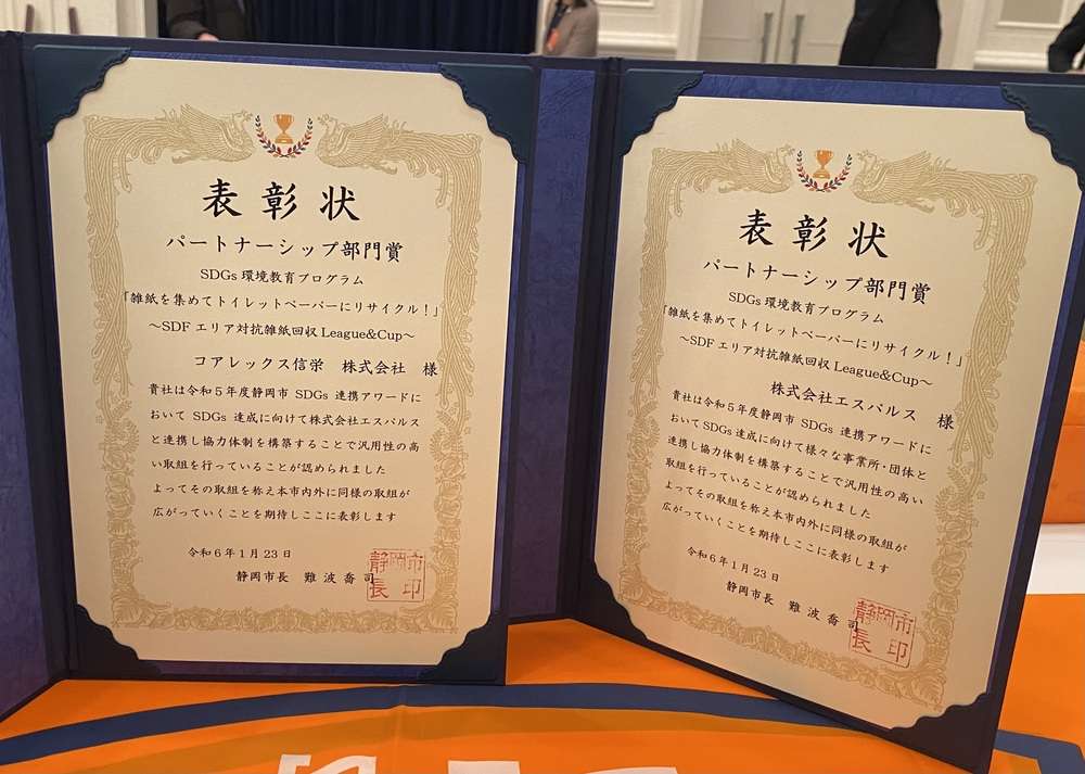 『令和5年度 静岡市SDGs連携アワード』にて、エスパルスがエントリーした活動「SDGs環境教育プログラム雑紙を集めてトイレットペーパーにリサイクル!~SDFエリア対抗雑紙回収League&Cup~」が部門賞/パートナーシップ部門を受賞しました。
