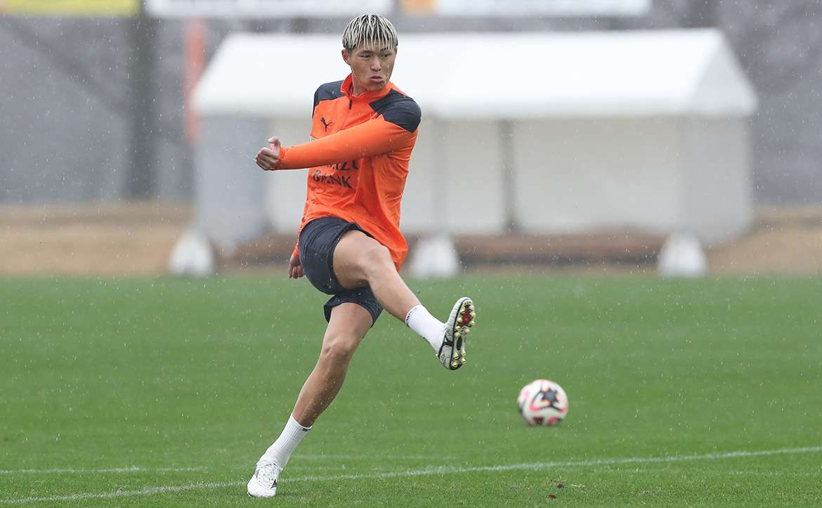 午後は室内での短いミーティングからスタート。定刻通り15時30分にはグラウンドに移動し、タッチ数制限付きのドリブルリレーや4人組でのロンド(鳥かご)などボールに触れながら次第に負荷を上げていった。ロングパス交換では雨の中でも成岡輝瑠がピタリとボールをトラップし、チームメイトから「ナイス!」と声が上がる場面もあった。