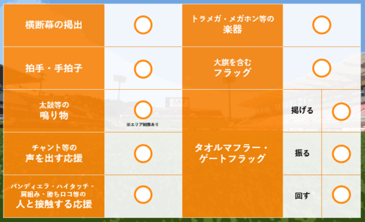 ※大旗の使用容認にあたって、対象エリアとなる席種では、フラッグにより一時的に視界を遮られるなどの場合がございますので、予めご理解、ご了承願います