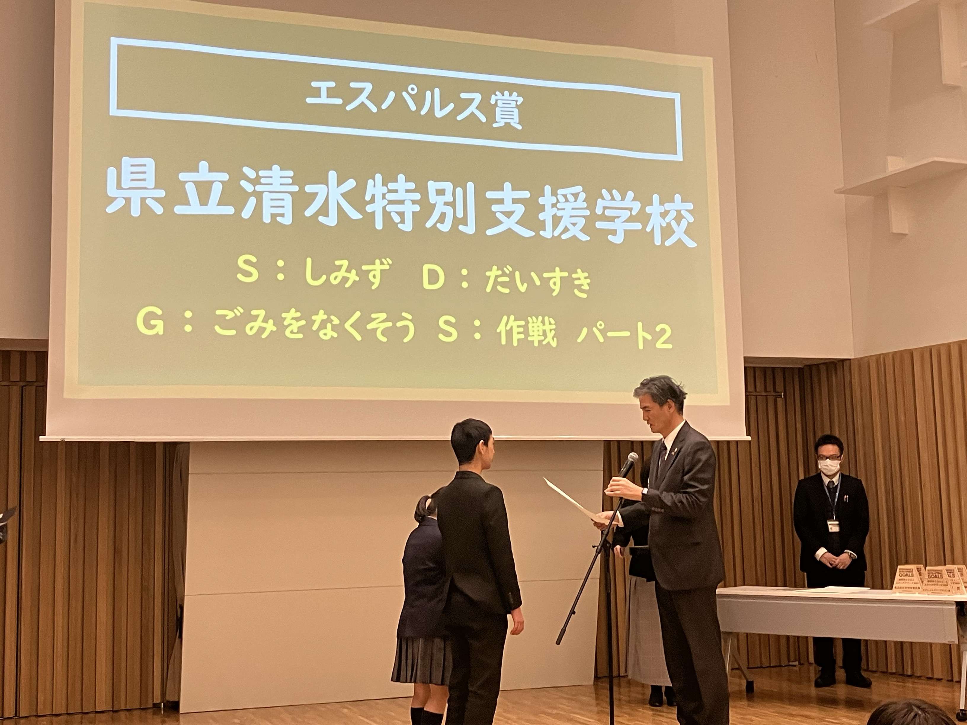 エスパルスは企業賞を県立清水特別支援学校中等部「S:清水D:だいすきGごみをなくそうS作戦パート2」に授与しました。清水特別支援学校が行った、三保の海岸清掃をきっかけに、海洋ごみ問題に取り組んだ実践は、『地球にやさしいサッカークラブ。次世代に快適にサッカーのできる環境。』をコンセプトに掲げた、「エスパルス エコチャレンジ」に相通ずるものがありました。今後は、一緒に社会連携活動ができればと思います。