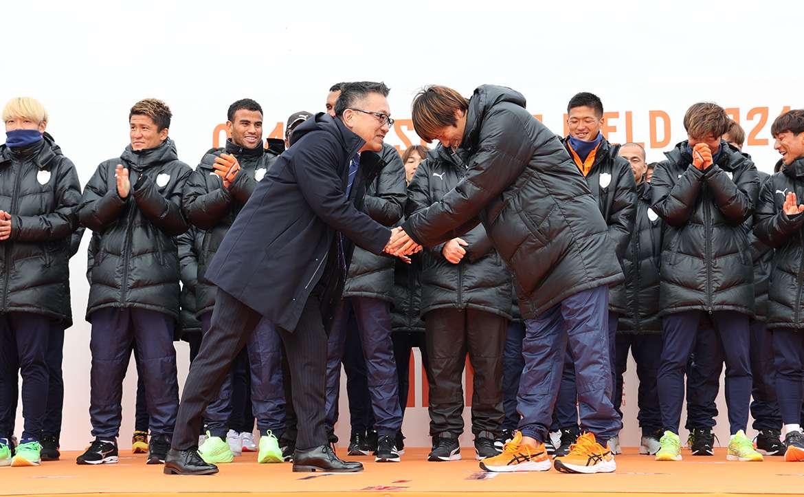 その後、株式会社エスパルス 代表取締役 山室晋也 から「寒い中出陣式にお集まりいただきありがとうございます。昨年は非常に厳しい時に、エスパルスファミリーの皆様には多くの力をいただきました。心から感謝しております。今シーズンのスローガンは『ONE FAMILY』ということで、もう一年結束して力を貸していただいと思います。必ずJ1に昇格し皆様へ恩返しをしたいと思っておりますのでよろしくお願いいたします。」と挨拶しました。