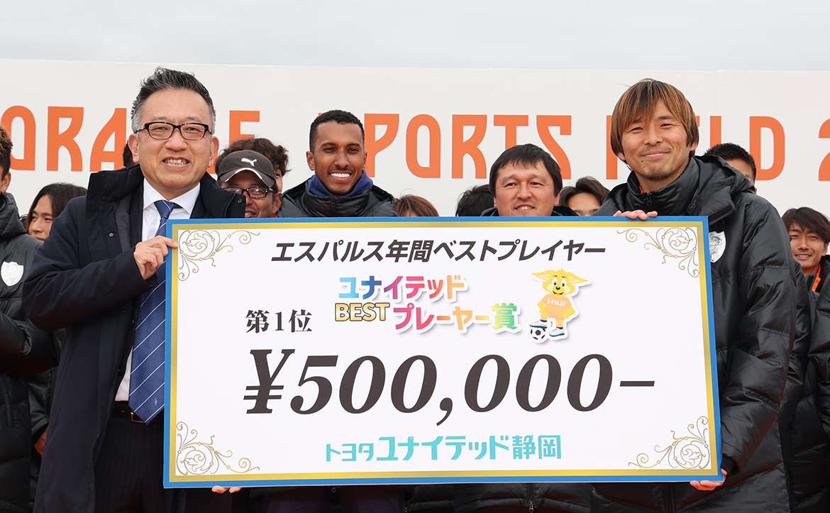 その後桝谷様より「いよいよ来週からシーズンが始まります。今年は優勝、J1昇格しかありません。サポーターの皆様、選手の皆様、一体となって頑張っていきましょう。私たちトヨタユナイテッド静岡はベストプレイヤー賞を実施させていただいて7回目になります。これからもずっとエスパルスを応援していきたいと思いますので、どうぞよろしくお願いいたします。皆様今年も頑張りましょう。」と激励のお言葉をいただきました。桝谷様ありがとうございました。