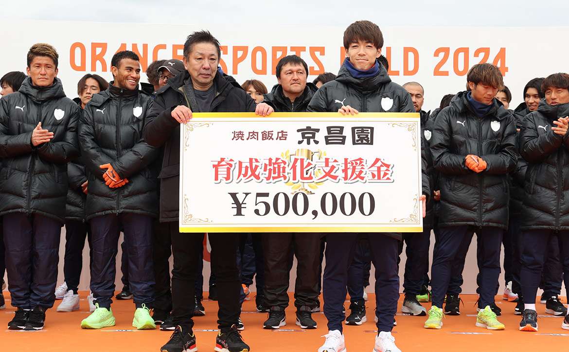 続いて、焼肉飯店 京昌園様から支援金贈呈。育成強化支援金と、お食事商品券をいただきました。育成強化支援金は「焼肉飯店 京昌園」で販売されたエスパルス応援メニューの売上の一部を支援金としていただくもので、将来エスパルスの中心を担う選手を育成することを目的とされたものです。またお食事券商品券は2024シーズンのエスパルスの躍進を祈願することを目的として贈呈していただき、京昌園様のCMにも出演している西澤健太選手がパネルを受け取りました。
