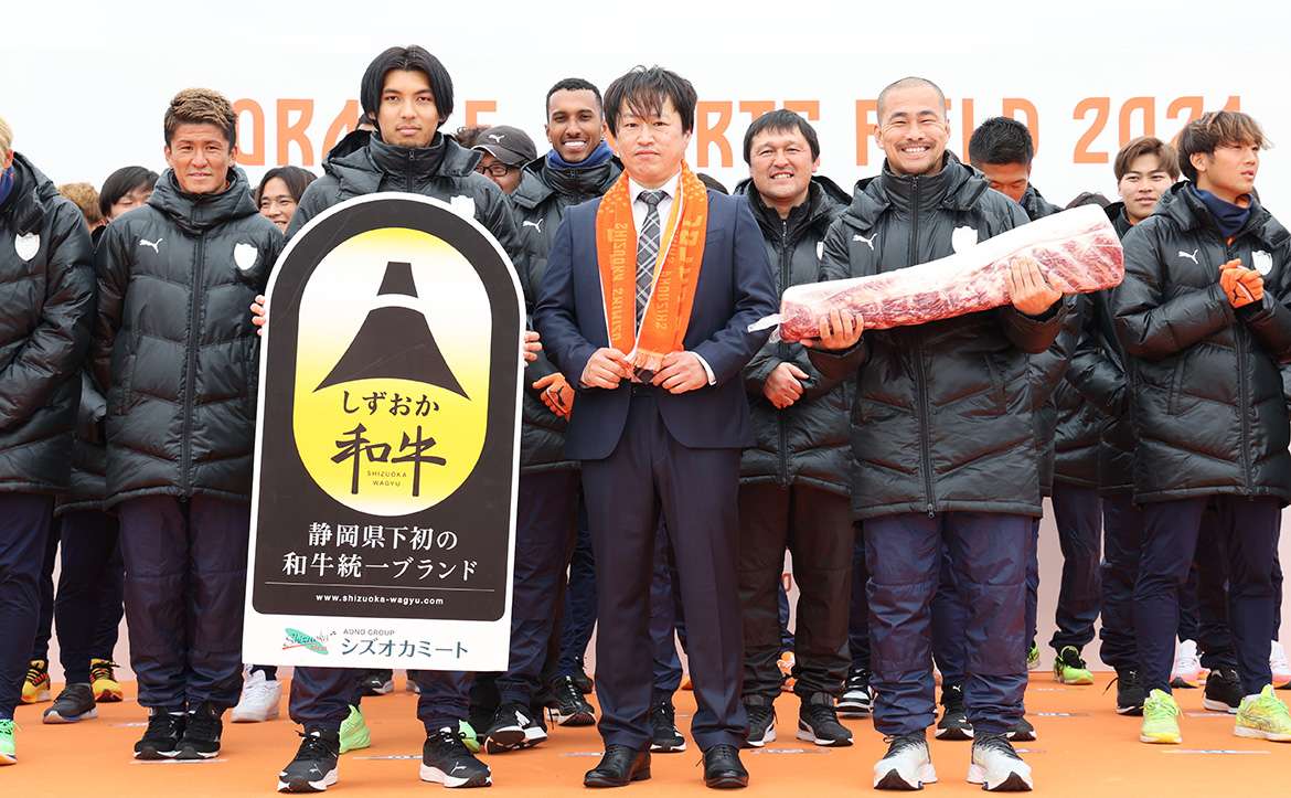 さらに、同じくクラブパートナーの株式会社シズオカミート様より、チームの激励を目的に静岡和牛10kgを贈呈していただきました。株式会社シズオカミート 山口哲司常務取締役からは「昨年は沢山のゴールをみせていただき、盛り上げていただきありがとうございました。しかしあと一歩というところで悔しい思いもしました。それは選手とスタッフの皆様が一番感じていると思います。ぜひ地元産お肉を食べていただき昇格、優勝を目指して頑張っていただきたいと思います。」とのお言葉をいただきました。本日誕生日の吉田豊選手、今シーズン新たに加入した高木選手が、パネルと実際のお肉を受け取りました。