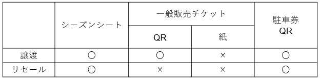 公式リセールサービスは「シーズンシートチケット」と「駐車券(QRのみ)」が出品できます。それ以外のチケットはリセール対象ではありませんので、ご確認の上、お間違えの無いよう購入をお願いいたします。