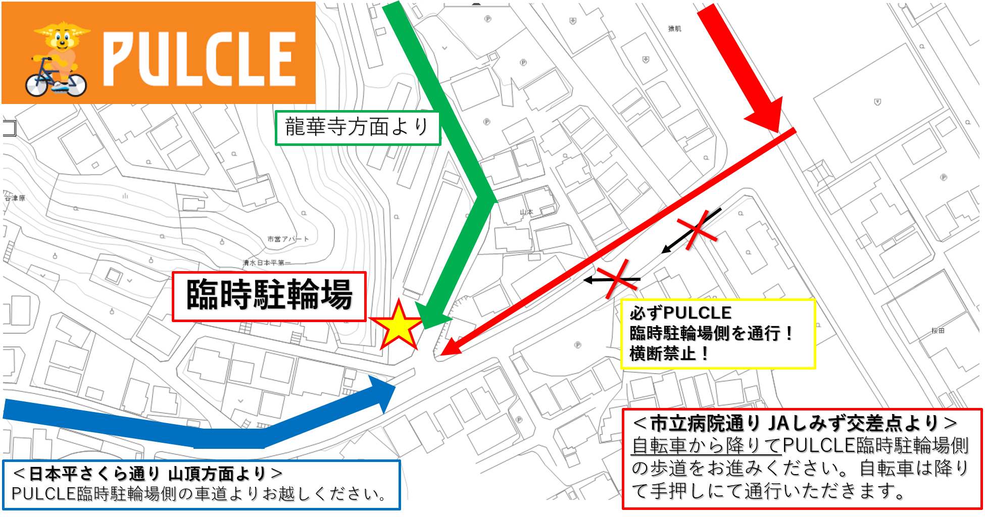 PULCLE臨時駐輪場側の車道よりお越しください。