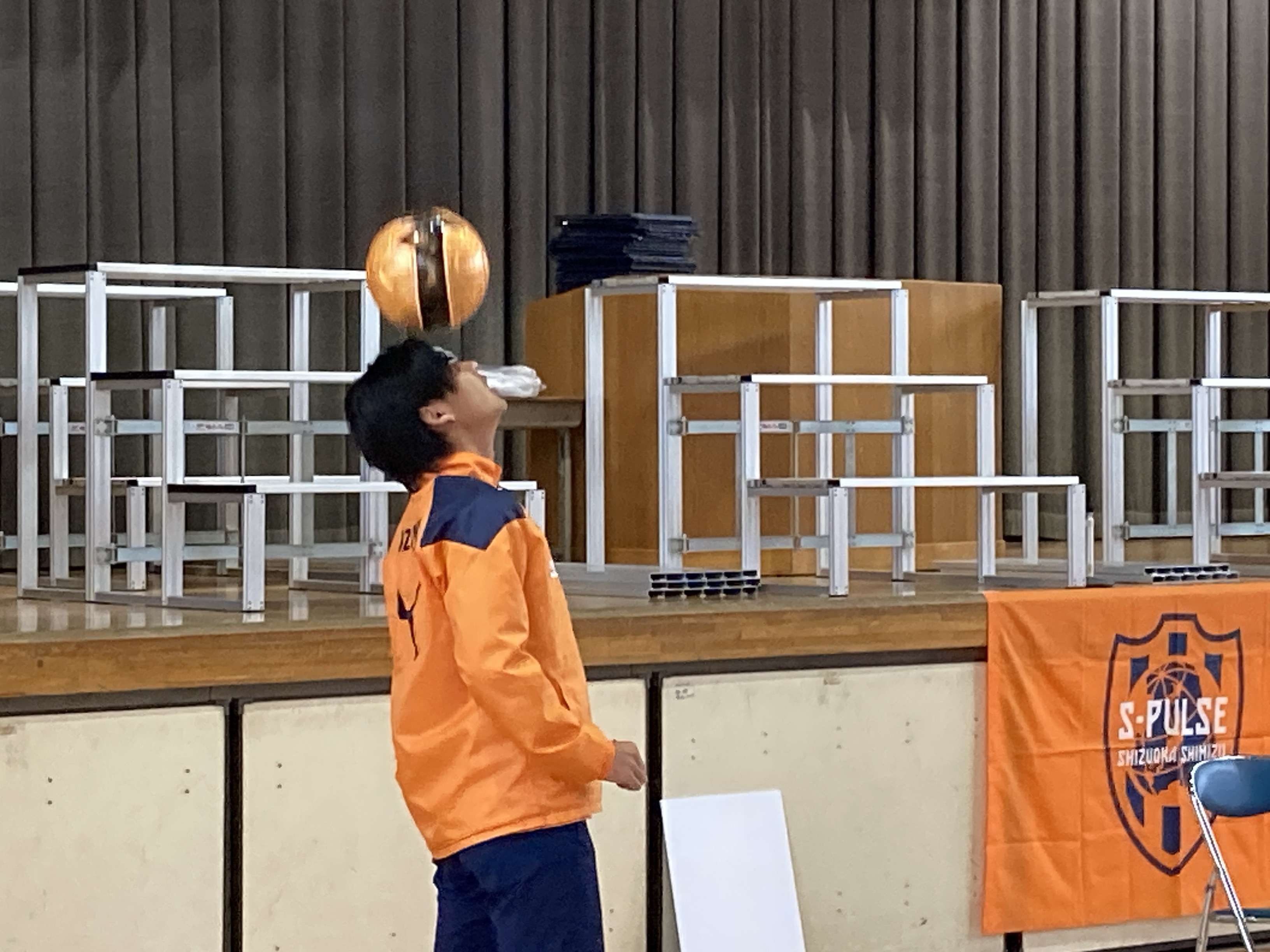 まず両選手が自己紹介し、高木選手がリフティングを披露しました。頭上にボールと留めると、児童たちからは拍手が上がりました。川本選手がシュート実演を行うと、そのボールの速さに驚きの声が体育館に響きました。