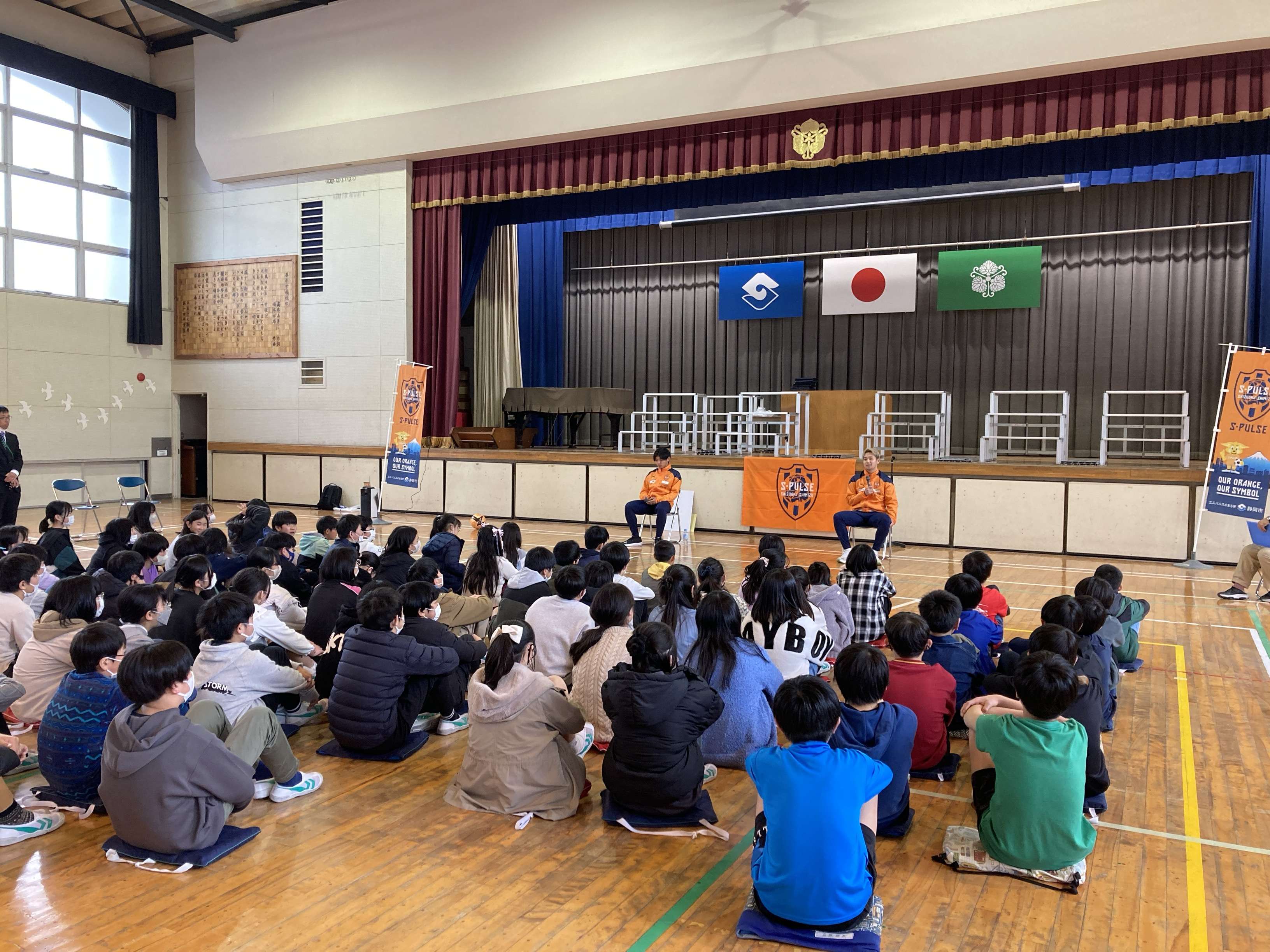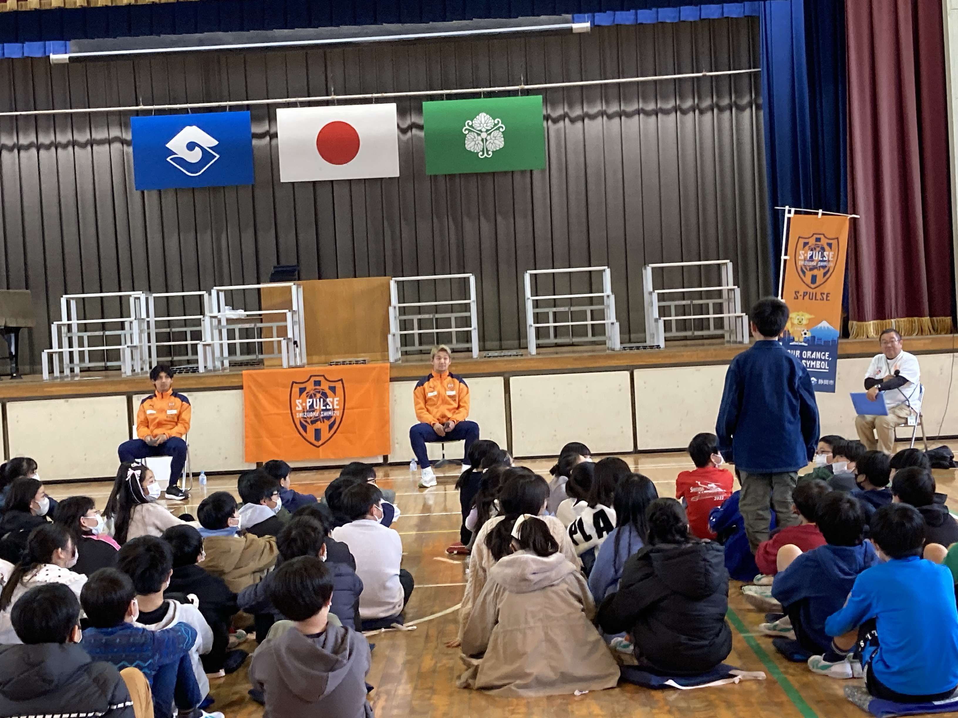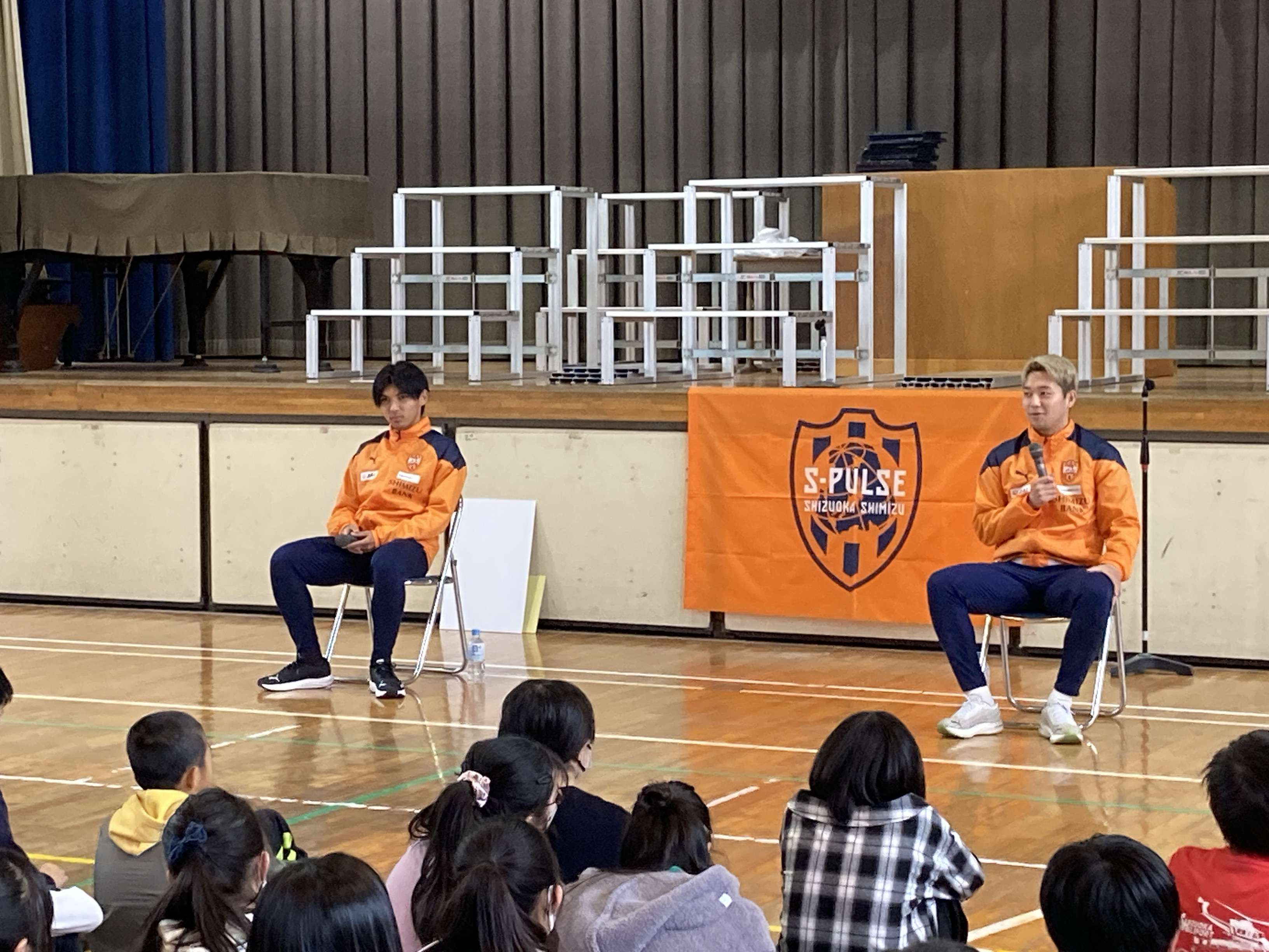 3/6(水)エスパルスが実施するホームゲーム招待企画『静岡市小学生招待事業』の告知とキャリア教育授業実施のため、川本梨誉選手、高木践選手がホームタウン静岡市の静岡市立葵小学校(6年生95名)を訪れ、交流を深めました。