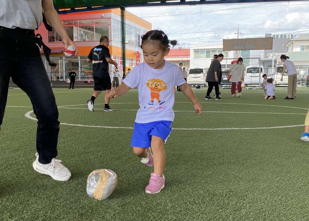 作ったボールを「なげる」・「とる」といった動作を必要とするキャッチボールや、ボールを「ける」・「わたす」動作が主となるシュート練習などを行います。最後はボールを使ったサッカー対決を親子で実施し、ゲーム形式の中で楽しく運動する機会を創出します。