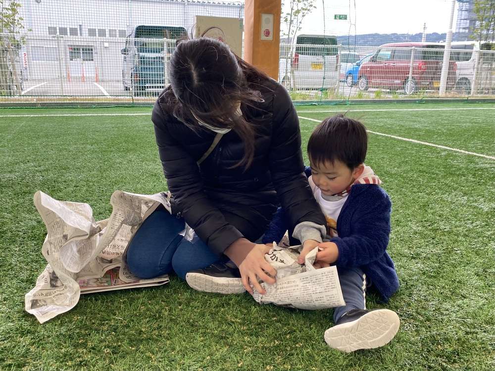 親子で新聞紙を丸めてサッカーボール作りにチャレンジします。手先を使ってモノを作る「工作」は子どもの成長には欠かせない重要な要素の1つとなります。工作を取り入れることで子供たちの好奇心に刺激を与え、集中力を高めます。