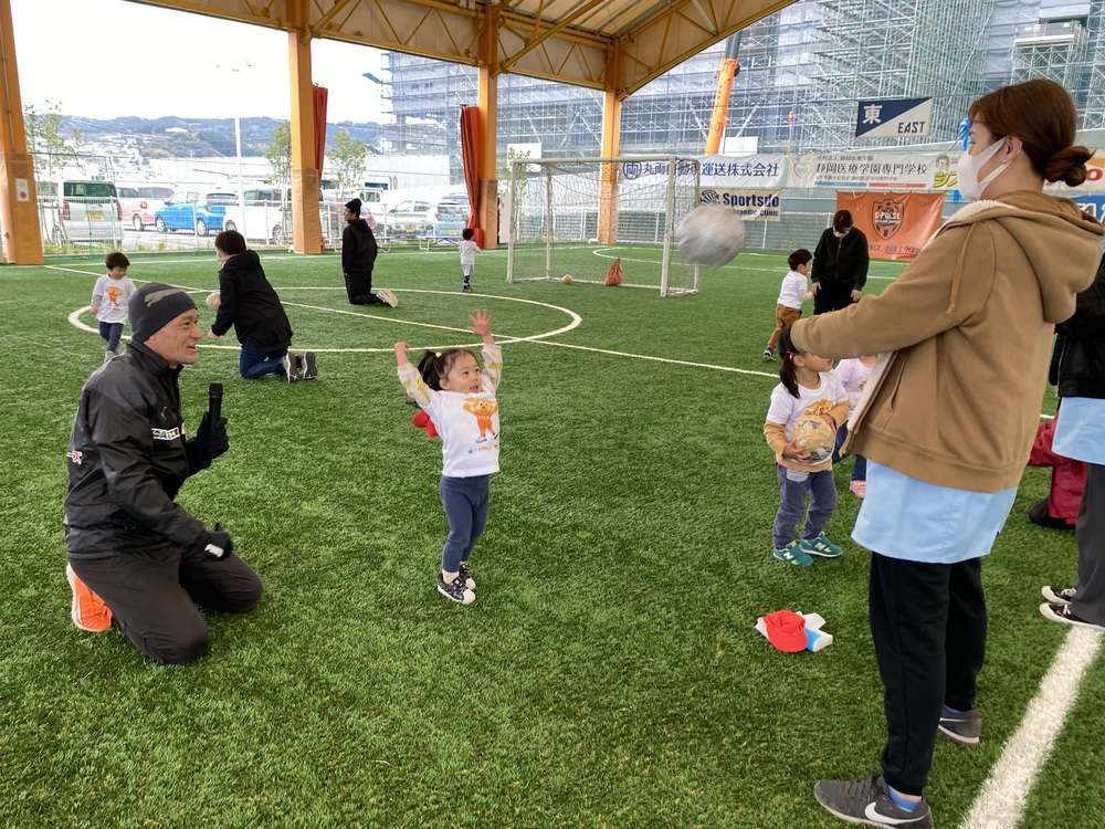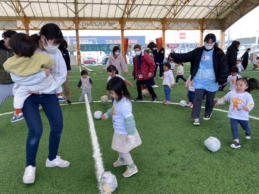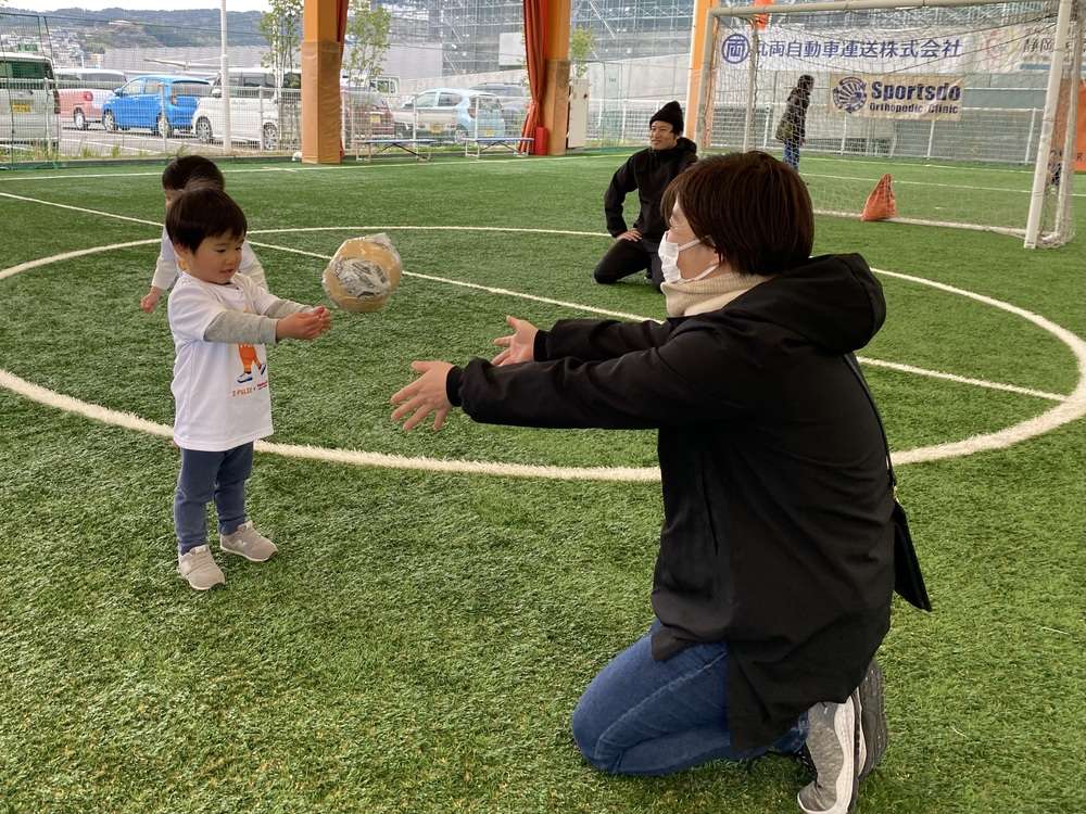 作ったボールを「なげる」・「とる」といった動作を必要とするキャッチボールや、ボールを「ける」・「わたす」動作が主となるシュート練習などを行います。最後はボールを使ったサッカー対決を親子で実施し、ゲーム形式の中で楽しく運動する機会を創出します。