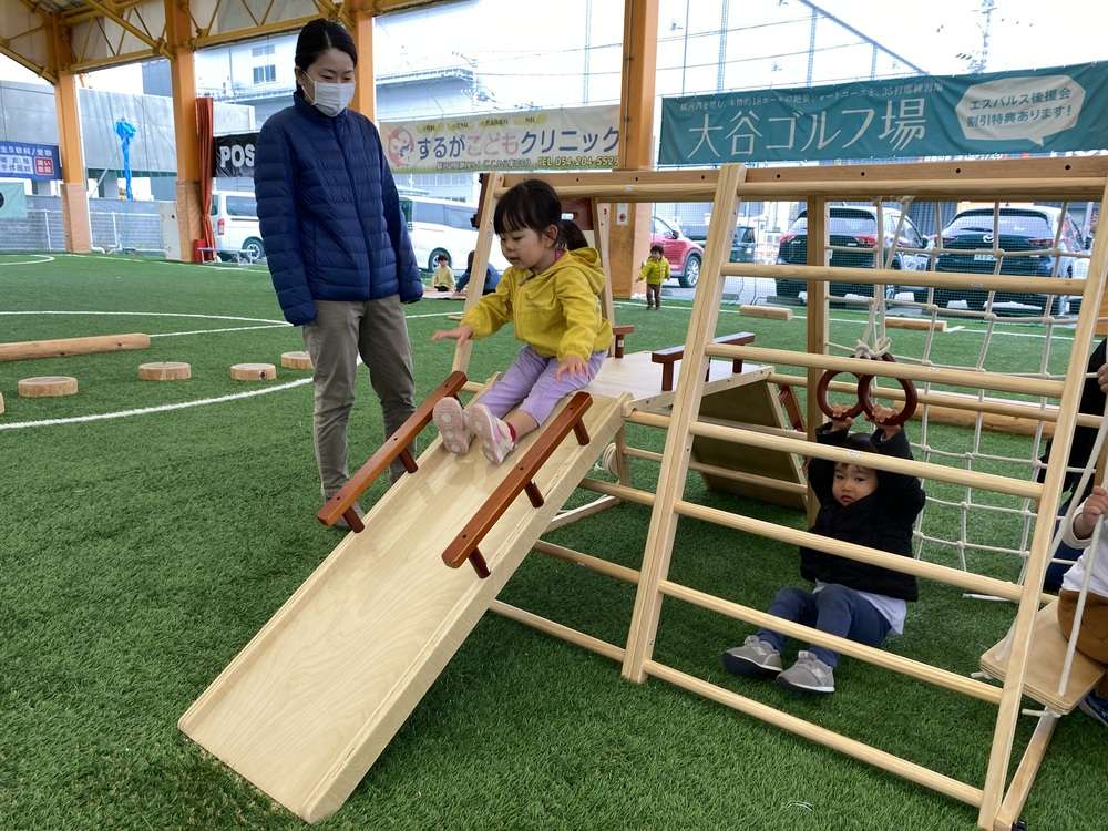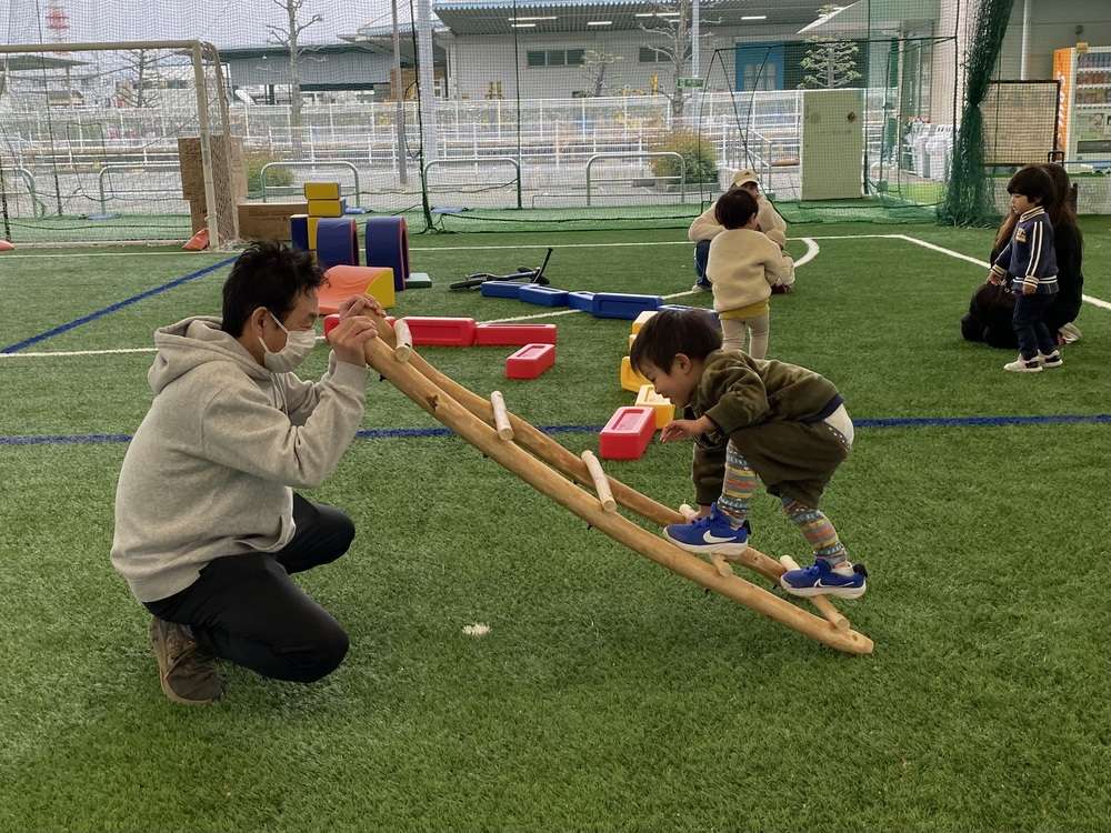 指導者から遊具を使った運動遊びについて簡単なレクチャーを受けていただいた後、お子さまの自由な発想を育みながら、無理なく身体を動かし運動に親しんでいただくことがこの企画の特徴です。