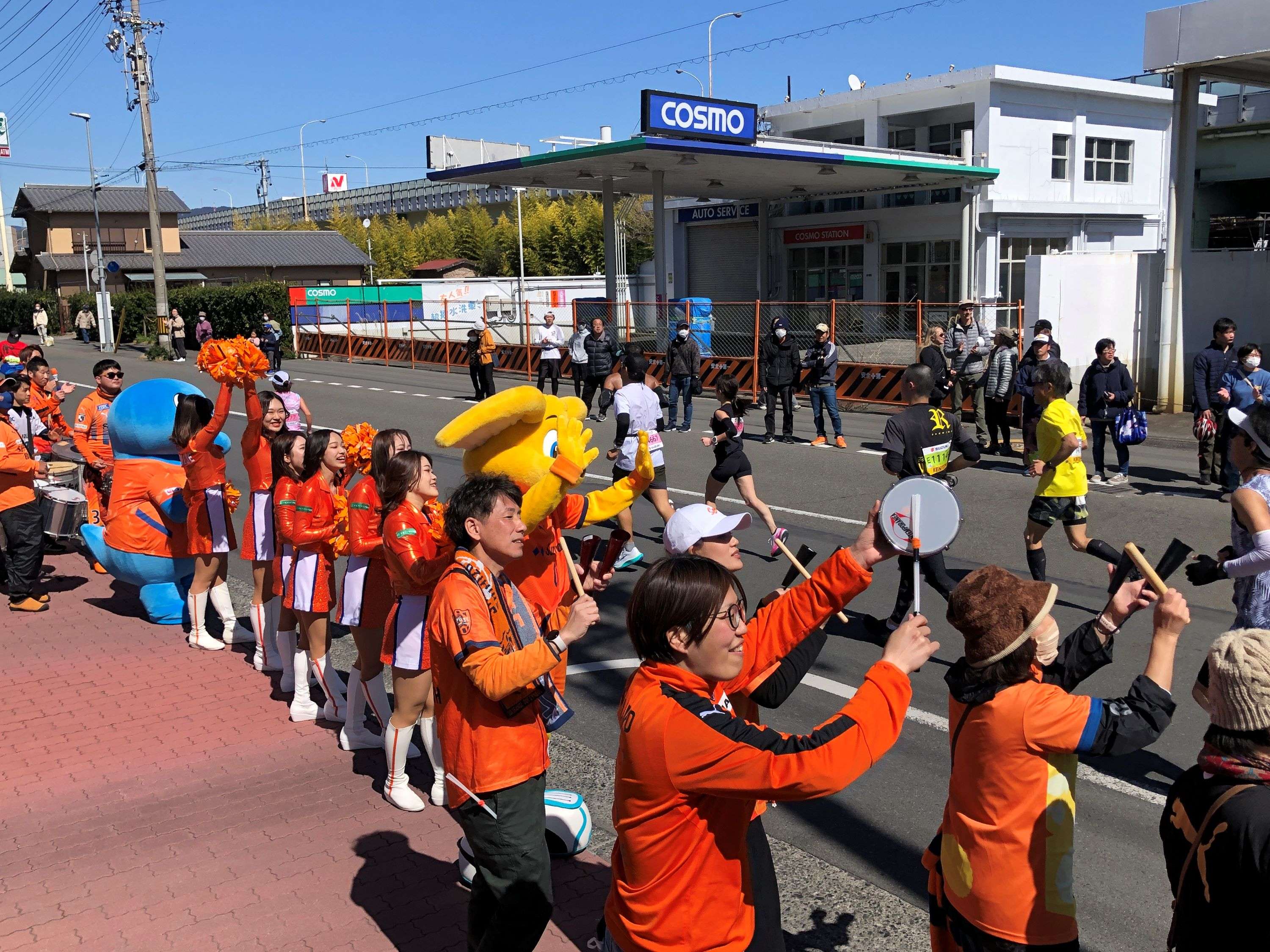 フィニッシュエリア(ゴール付近)では、オレンジウェーブのメンバーが、清水区庁舎前では、清水区広報キャラクター「シズラ」と共に、パルちゃんとエスパルスサンバ隊の皆さんで、最後のストレートを後押しすべく応援をしました。エスパルスボランティアサポーターの皆さんにもフィニッシュエリアでボランティア参加いただきました。