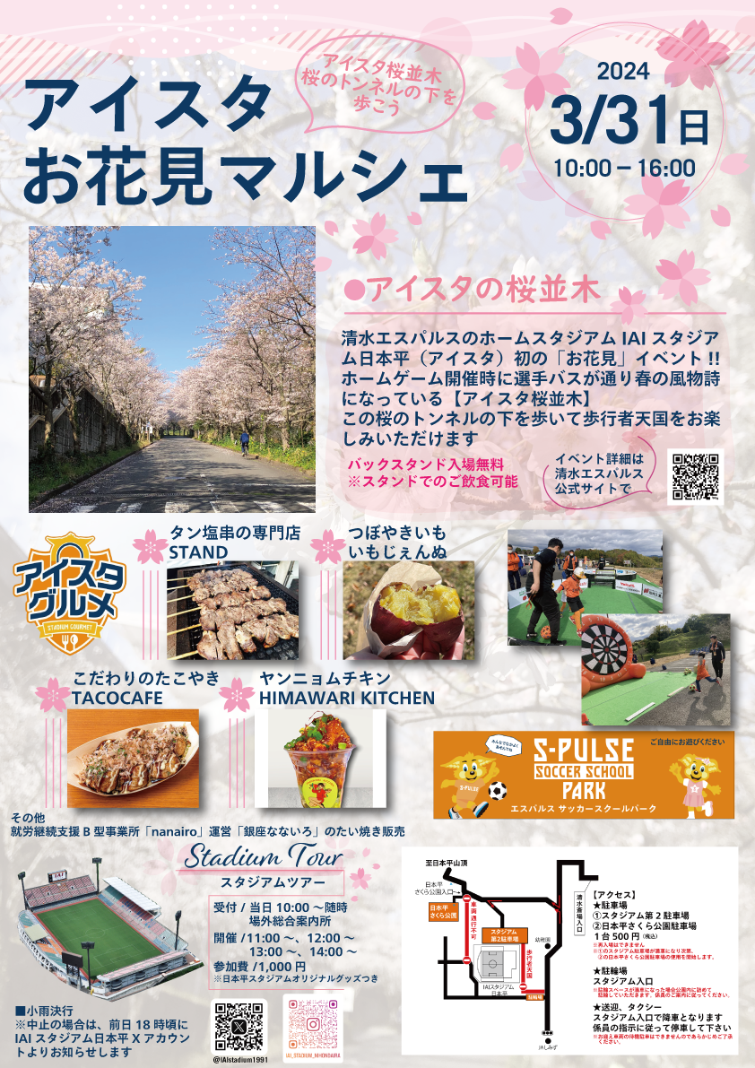 清水エスパルスのホームスタジアム「IAIスタジアム日本平(アイスタ)」で初の「お花見」イベントを実施します。ホームゲーム開催時に選手バスが通り、春の風物詩になっている、【アイスタ桜並木】。「アイスタお花見マルシェ」では、この桜のトンネルの下を歩いて歩行者天国をお楽しみいただけます。アイスタグルメ店舗も出店しますので、美味しいグルメやお飲み物を召し上がりながら「お花見」をお楽しみください。3月31日は静岡市の桜満開予想日になっています!ご来場お待ちしています。