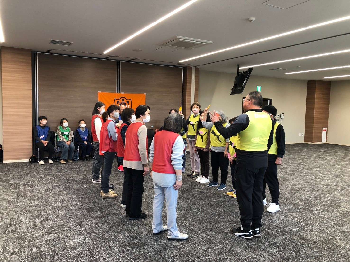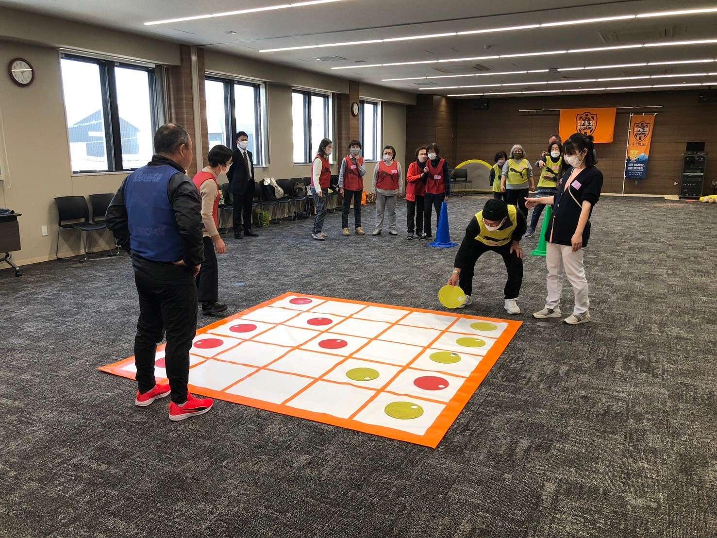 今泉コーチから「二つのことを同時に行うことが大切。できないことを楽しんでください」とアドバイスを受けた参加者の皆さんは、頭と身体を同時に使うメニューにチャレンジしていきました。その後もお手玉を使った運動や、2チームに分かれての五目並べゲームを楽しみ、最後はウォーキングフットボールで盛り上がりました。サッカーは未経験の方がほとんどでしたが、ボールを追いかける姿からは初めてとは思えない熱が感じられました。ゴールが決まった瞬間はハイタッチで喜びあうなど、終始たくさんの笑顔と笑い声が出ていました。