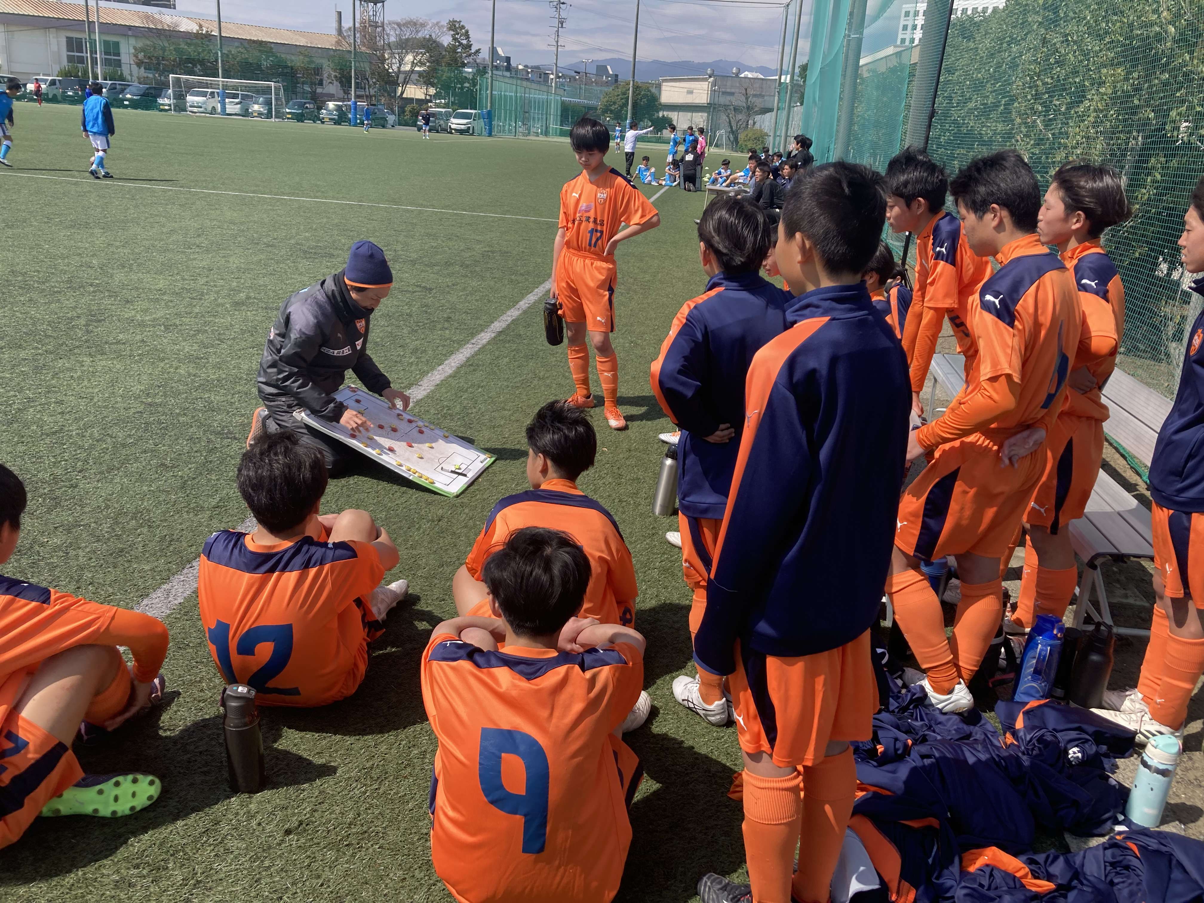 毎試合そうですが、ハーフタイムのミーティングではまず選手同士で試合のことについて話し合いをしてもらってから、コーチが作戦ボード等を使って後半の戦い方の指示等をします。