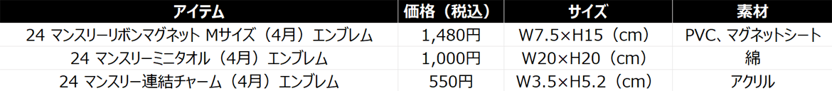 3月より販売を開始した、毎月違うデザインのマンスリーグッズ。