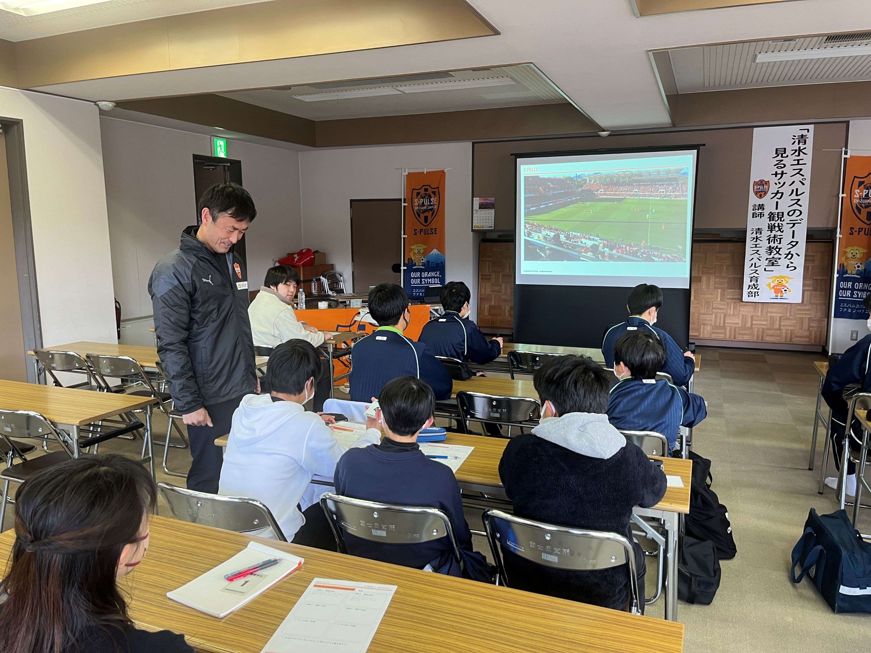 教室では、エスパルスの得点に至るまでのプレーの流れについて、4局面・3エリア・5レーンの「3つの視点」から映像を見て考えました。「守備をしながら攻撃の準備をしている」「逆サイドをうまく使えている」といった気づきがうまれ、ボールを持っていない選手にも注目して試合を見られるようになりました。また、平均ゴール数や枠内シュート率などのデータの見方や分析について澤野が解説すると、参加者は真剣に耳を傾け、スポーツにおけるデータ分析の重要性を感じていた様子でした。