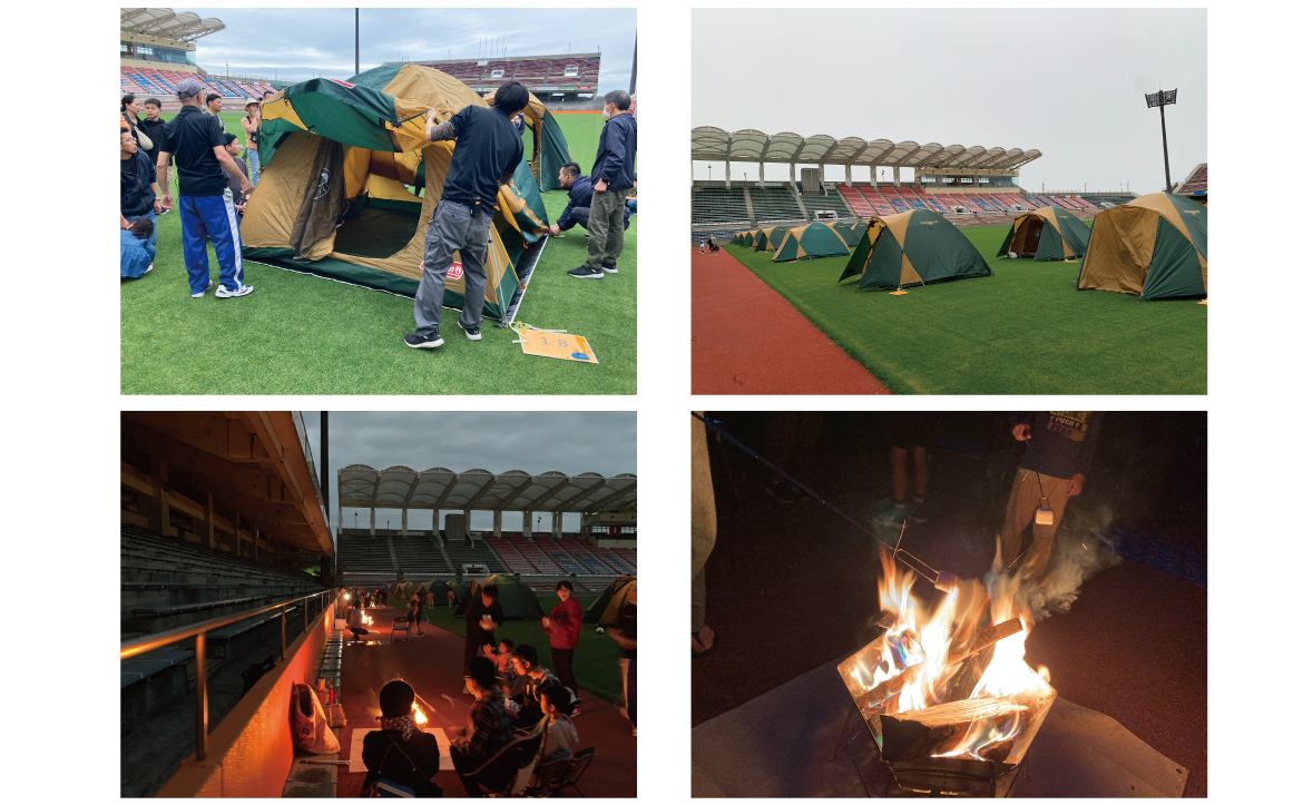 いつもは選手が試合を行っているピッチをスタンドからご覧いただいていますが、このイベントでは、そのピッチにテントを建ててスタジアムにお泊りいただく企画になります。
