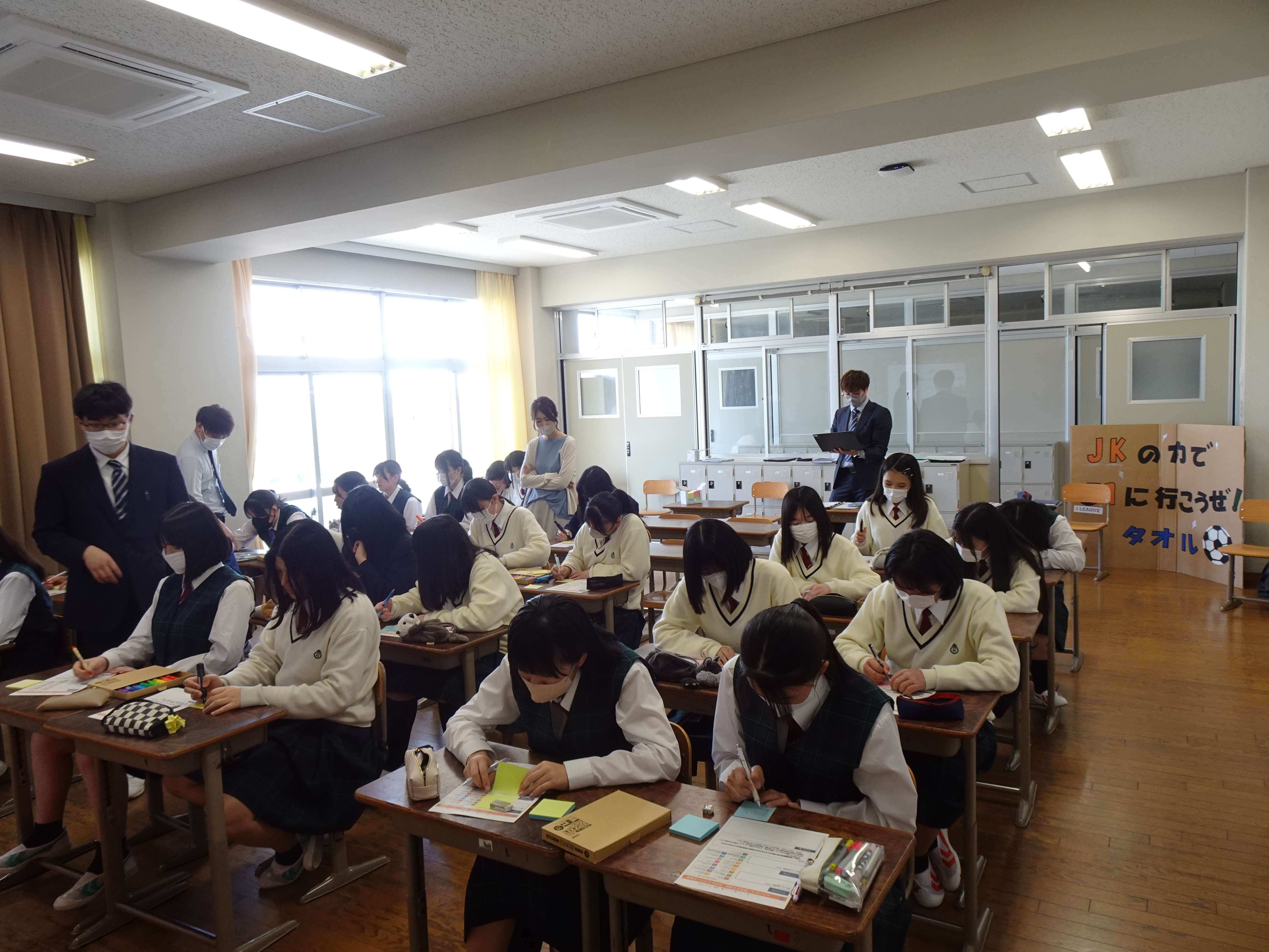 最初は、昨年度共同で実施したコラボタオルの授業や当日の販売の様子を写真とともに振り返りました。感想を聞くと、「最初は、サッカーのこともあまりよく知らず、作ったグッズも売れなかったらどうしようという不安がありましたが、授業を通してサッカーに興味を持つことができ、たくさんのお客さんに購入してもらうこともできて良い機会になった。」と答えてくれました。
