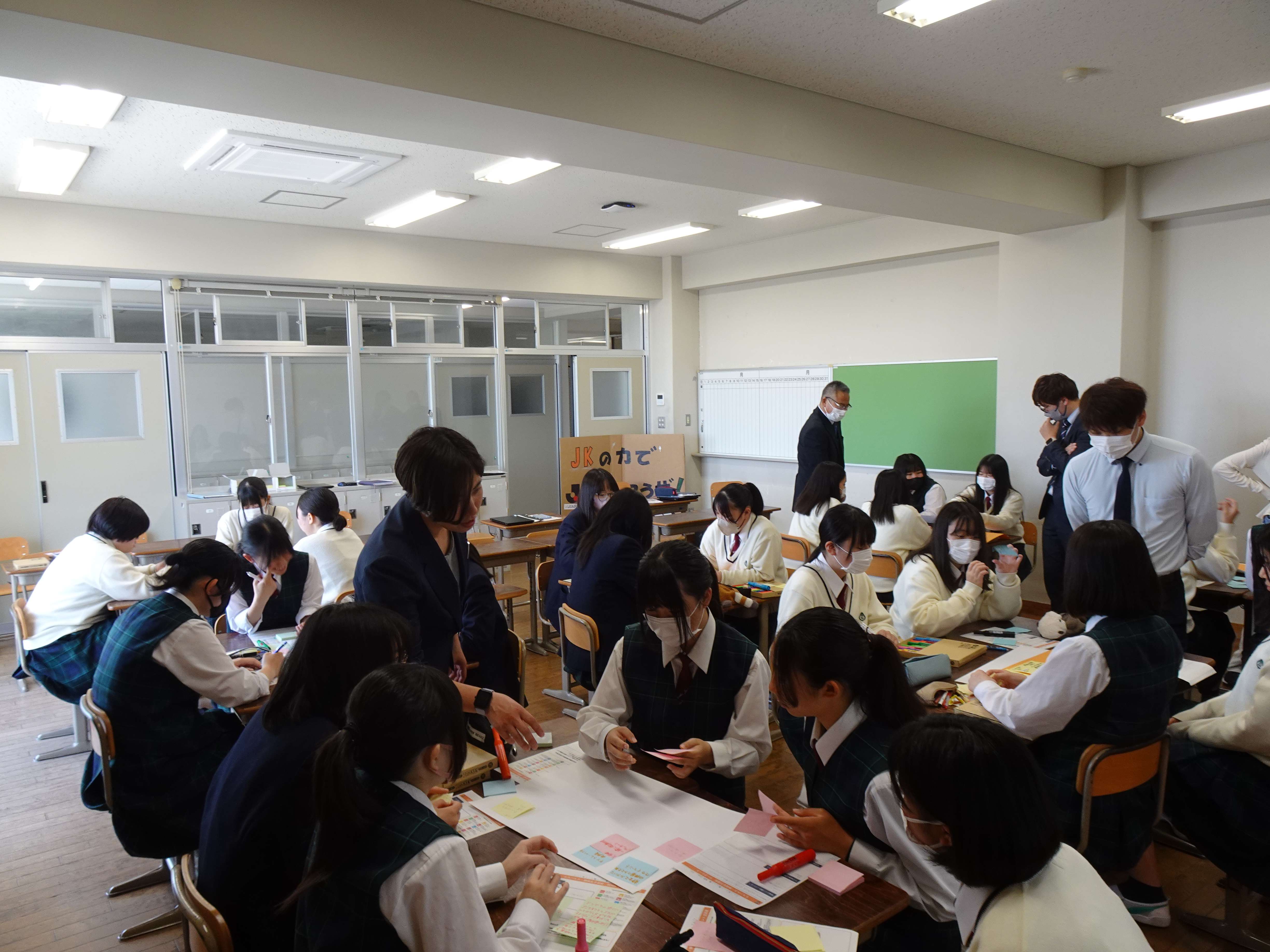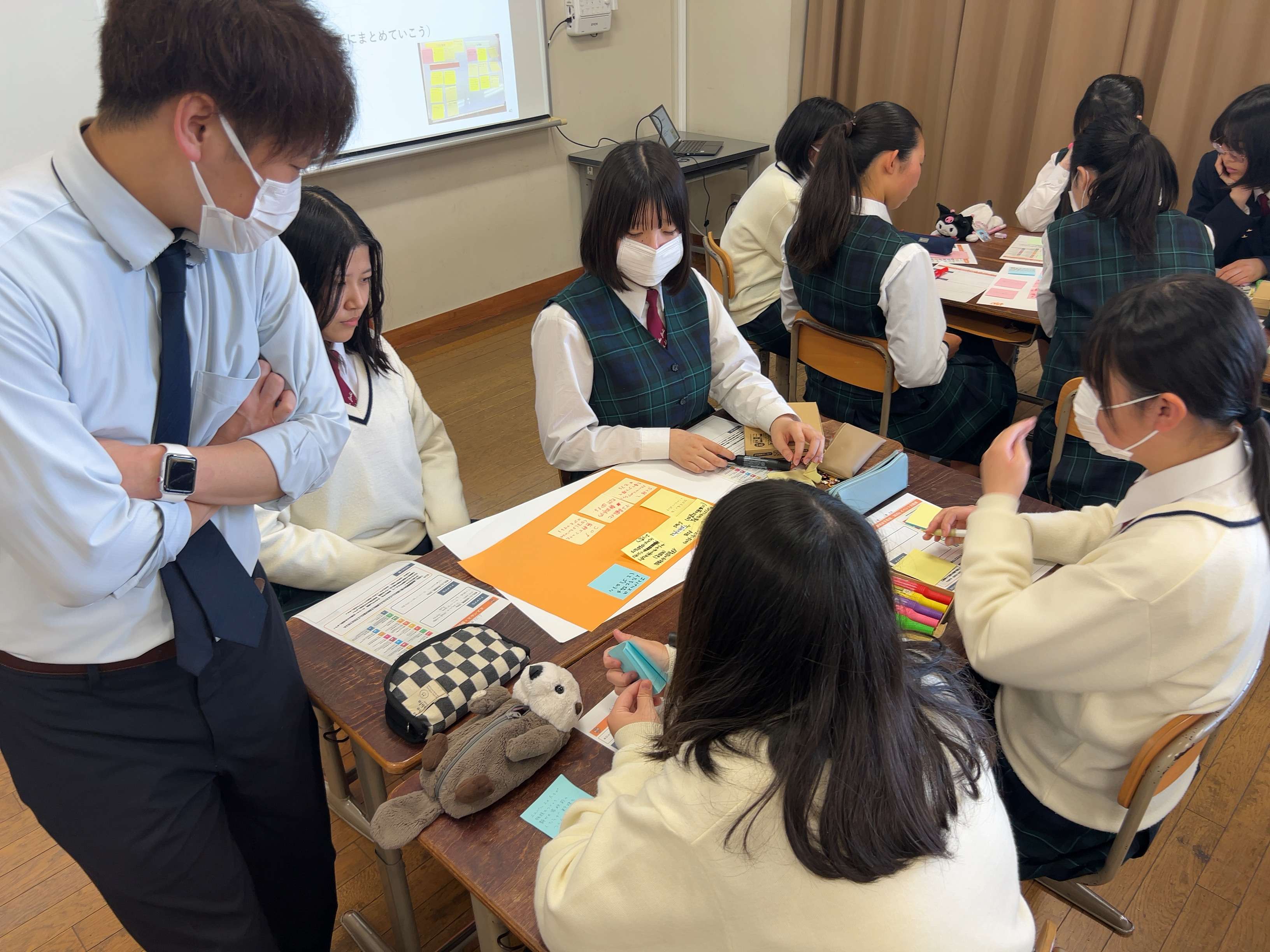 授業後半では、『SDGs・地域課題解決のために「清水エスパルス×静岡女子高校」でできる取り組みを考えよう!』をテーマにワークショップを行いました。個人で取り組みを考えた後、解決したい課題が似ている人同士でグループとなり、意見交換を行いました。食品ロスやごみ削減などの環境と、男女差別をなくしたい、サッカーの女子人口を増やしたいなどのジェンダーをテーマにあげた班が多かったです。ごみの分別や回収などの活動に参加すると選手からのメッセージ動画やグッズをもらうことができる。女性向けのスタジアムグルメを作る。アイスタを貸し切りにして異文化交流パーティーを開く。など、エスパルスの選手や施設、グッズやグルメ、SNSなど、さまざまなものとコラボさせる案もたくさん出ました。グループワークの時間は短かったですが、それぞれのテーマについて真剣に話し合い、地域課題解決のために、自分たちには何ができそうか、いろいろな方向から可能性を探ってくれました。