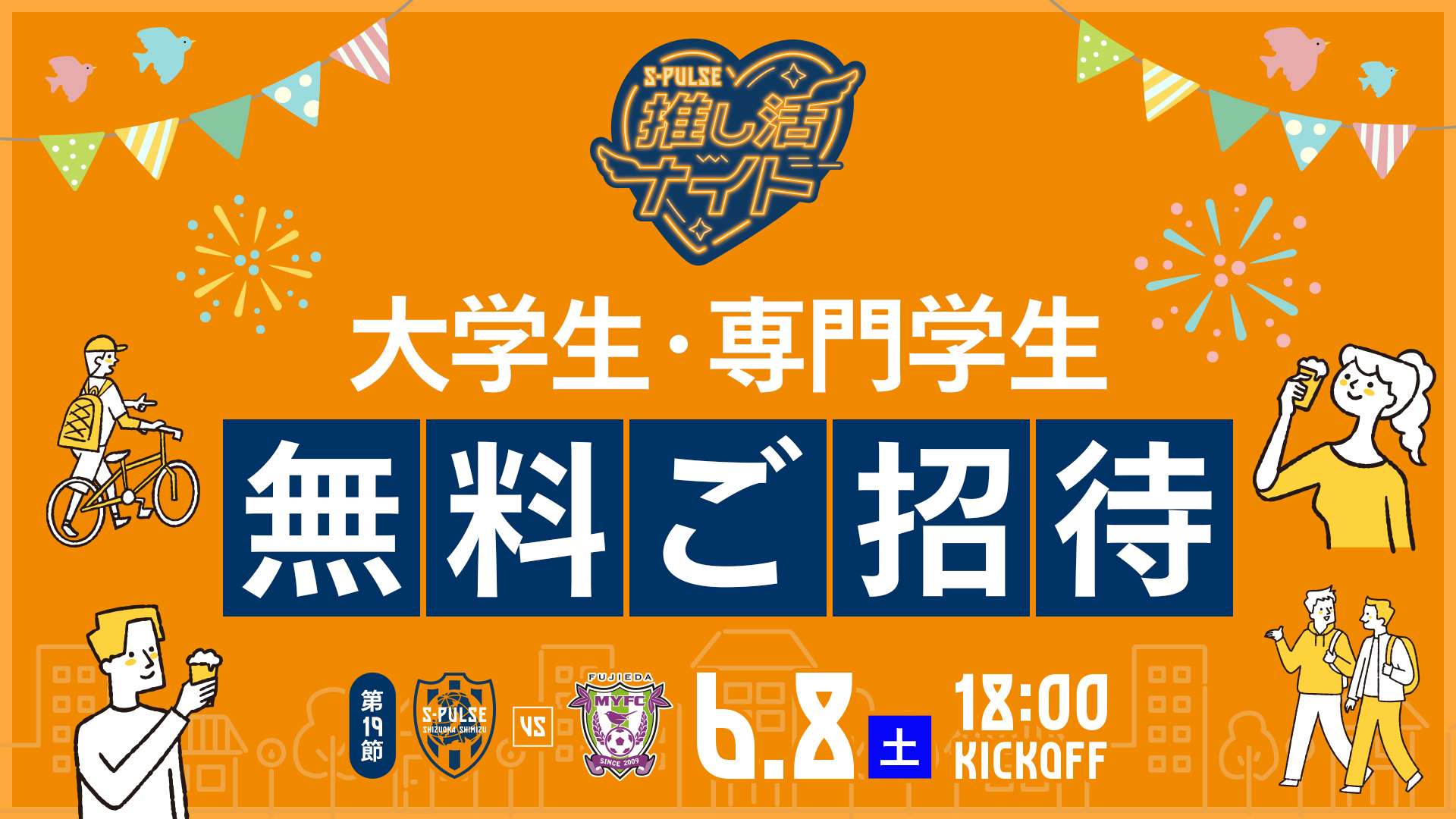 6/8(土)に行われる明治安田J2リーグ第19節 藤枝MYFC戦では、推し活ナイト特別企画として、全国の大学生・専門学生をエスパルスより無料ご招待することになりましたのでお知らせいたします。