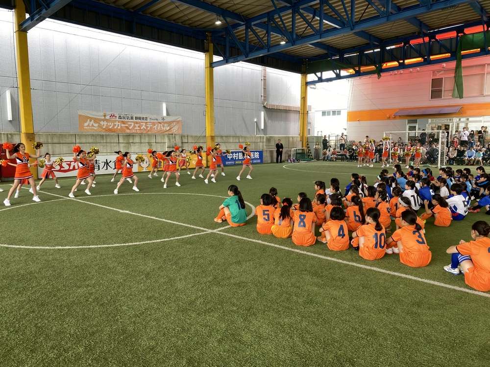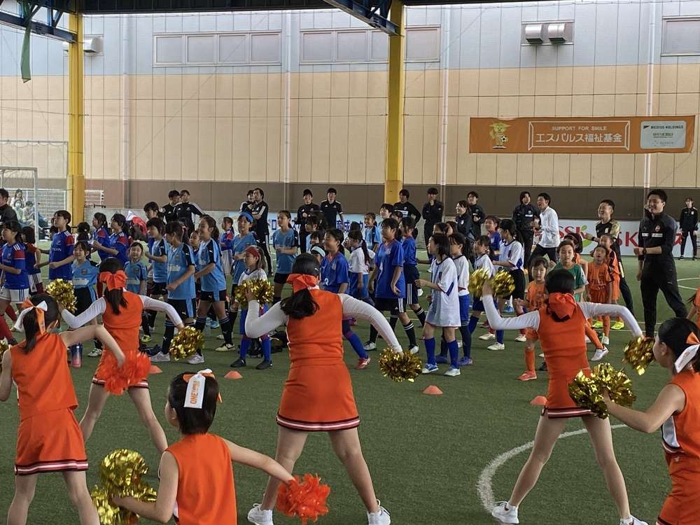 Jクラブ交流ガールズサッカーフェスティバル開会に先立ち、エスパルスダンススクールの30名がオープニングアクトに登場!ダンスを披露した後は、サッカーで参加した選手たち全員も一緒にダンスでウォーミングアップ!