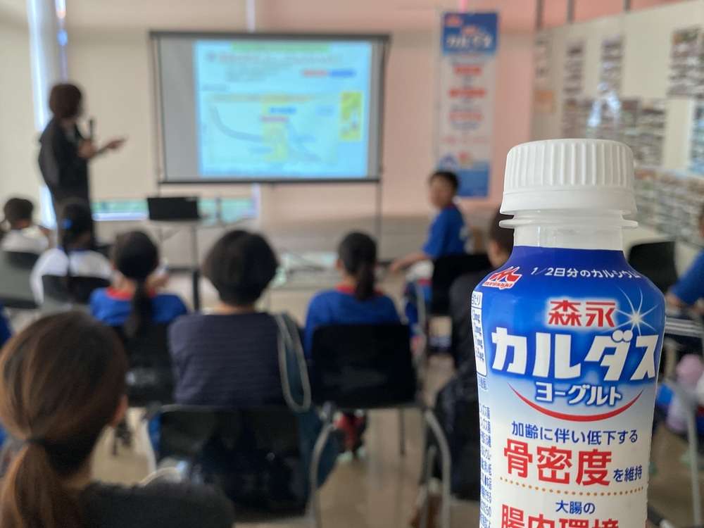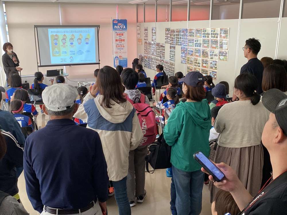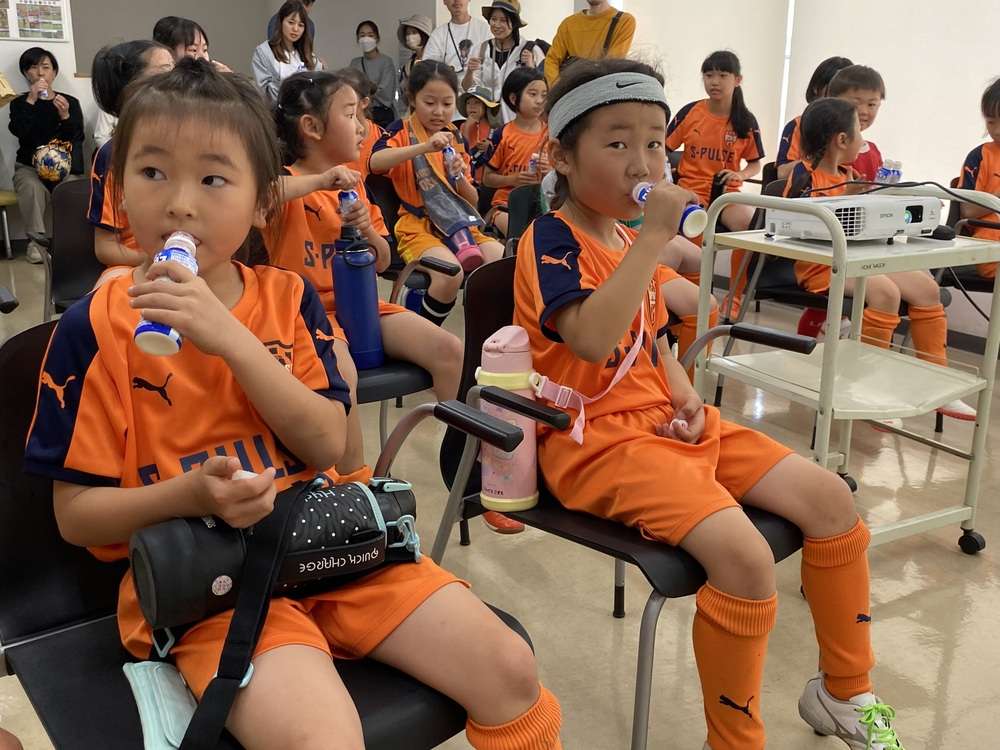 試合と試合の待ち時間を利用して、栄養講習会を開催しました。選手全員とその保護者、そして引率のコーチの皆様も参加いただき、森永乳業の「カラダ強くするのむヨーグルト」を試飲しながら、「ジュニア期のスポーツ栄養講座」~今しかできないからだづくり~をテーマに管理栄養士の先生よりお話しいただきました。