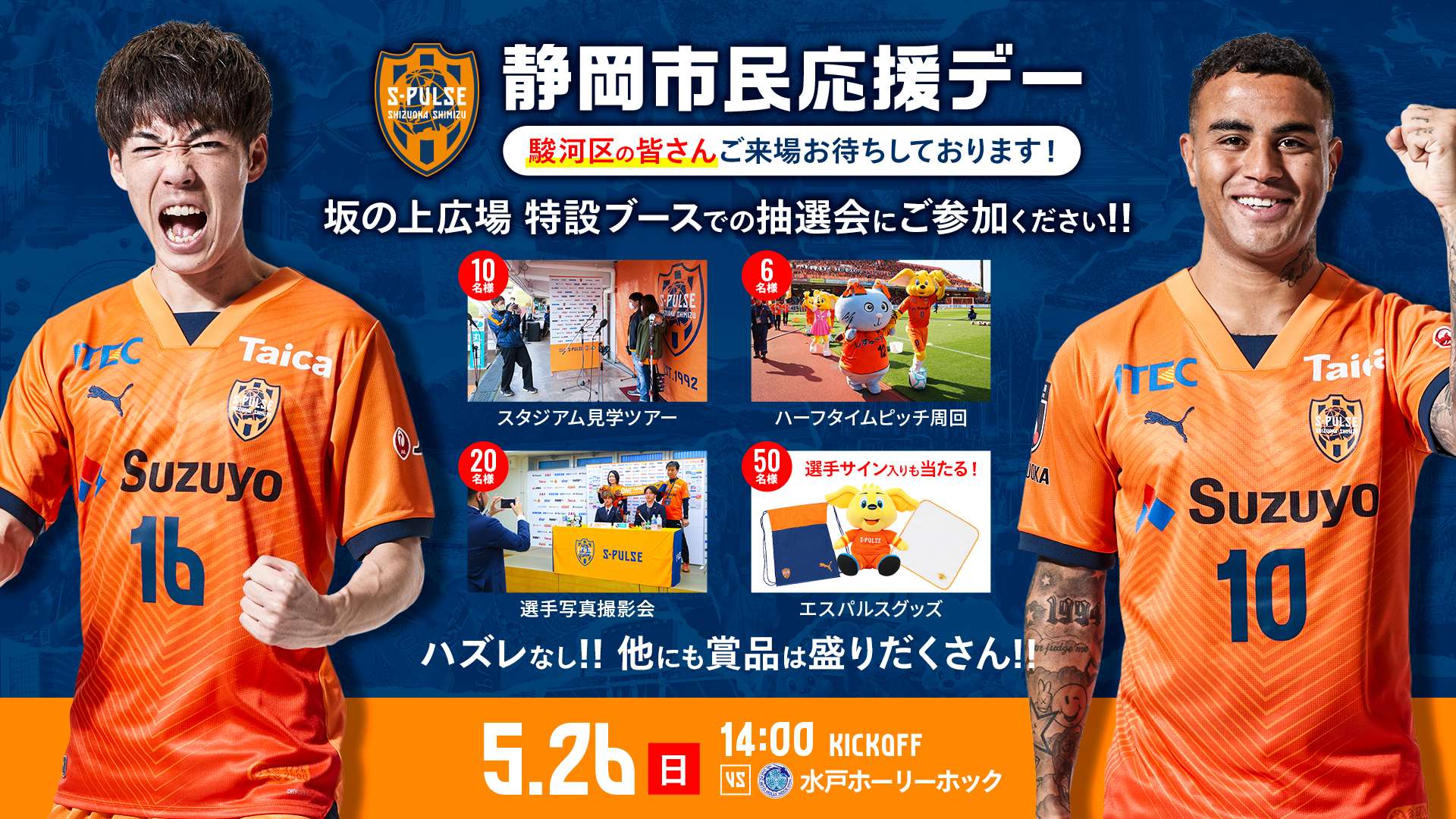 エスパルスは静岡市との交流事業として、ホームタウン静岡市にお住いの皆さんを対象に、ホームゲームへのご優待企画を実施しています。5/26(日)水戸戦は《駿河区》の日として、駿河区応援隊長「トロベー」が来場、また駿河区にある日本平動物園とのコラボ企画も実施します。皆さんのご来場をお待ちしております!