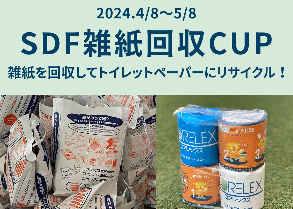 年間を通じてエスパルスドリームフィールド駿東・富士・清水・静岡・藤枝の各施設にて雑紙を回収し、トイレットペーパーへリサイクル。リサイクルされたトイレットペーパーは①各SDF施設にお戻し、②地域の公共施設に寄付の2パターンにて資源循環リサイクルモデルをご提案いたします。