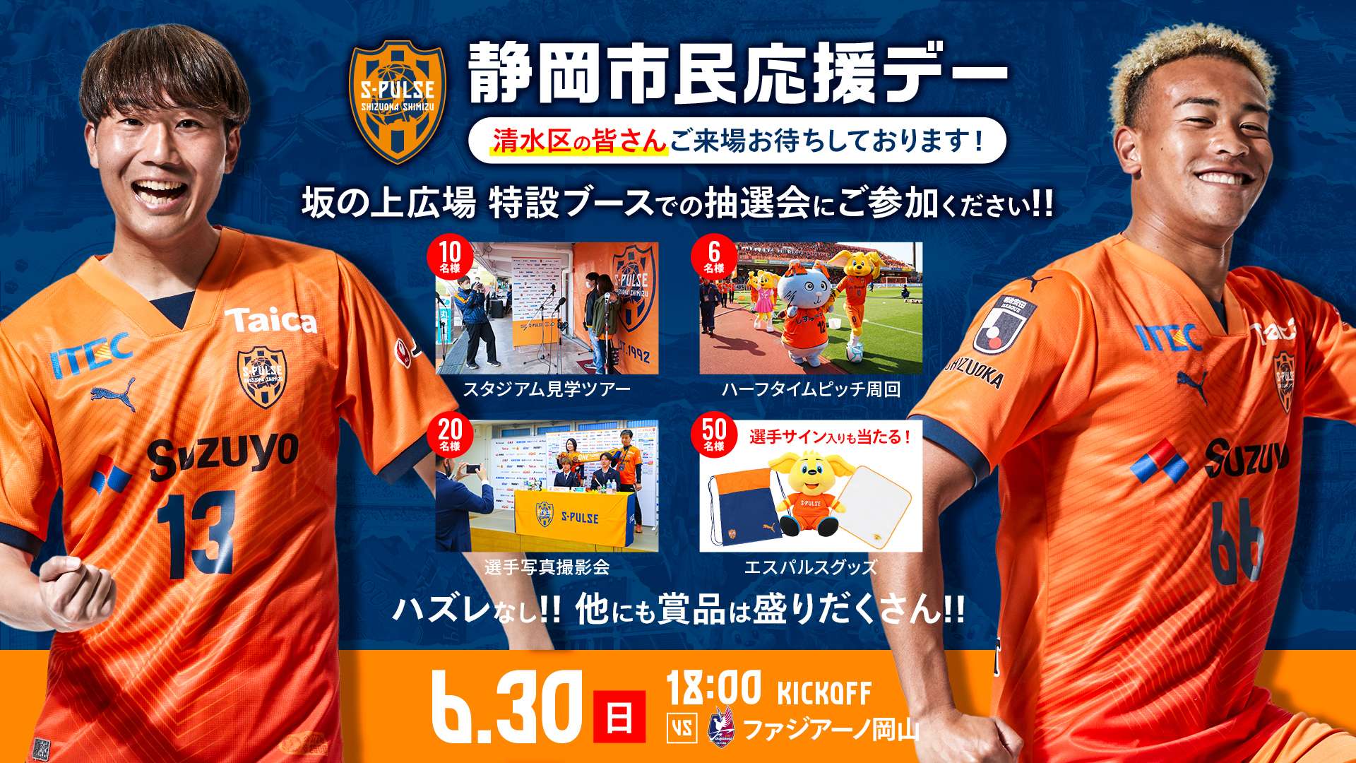 エスパルスは静岡市との交流事業として、ホームタウン静岡市にお住いの皆さんを対象に、ホームゲームへのご優待企画を実施しています。6/30(日)岡山戦は《清水区》の日として、静岡市清水区の魅力を発信するブース出展、清水区広報キャラクター「シズラ」来場、清水区 塩原博区長によるピッチグリーティングを実施いたします。