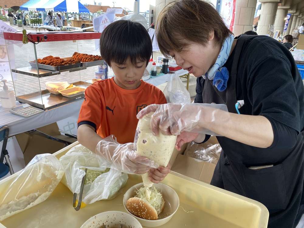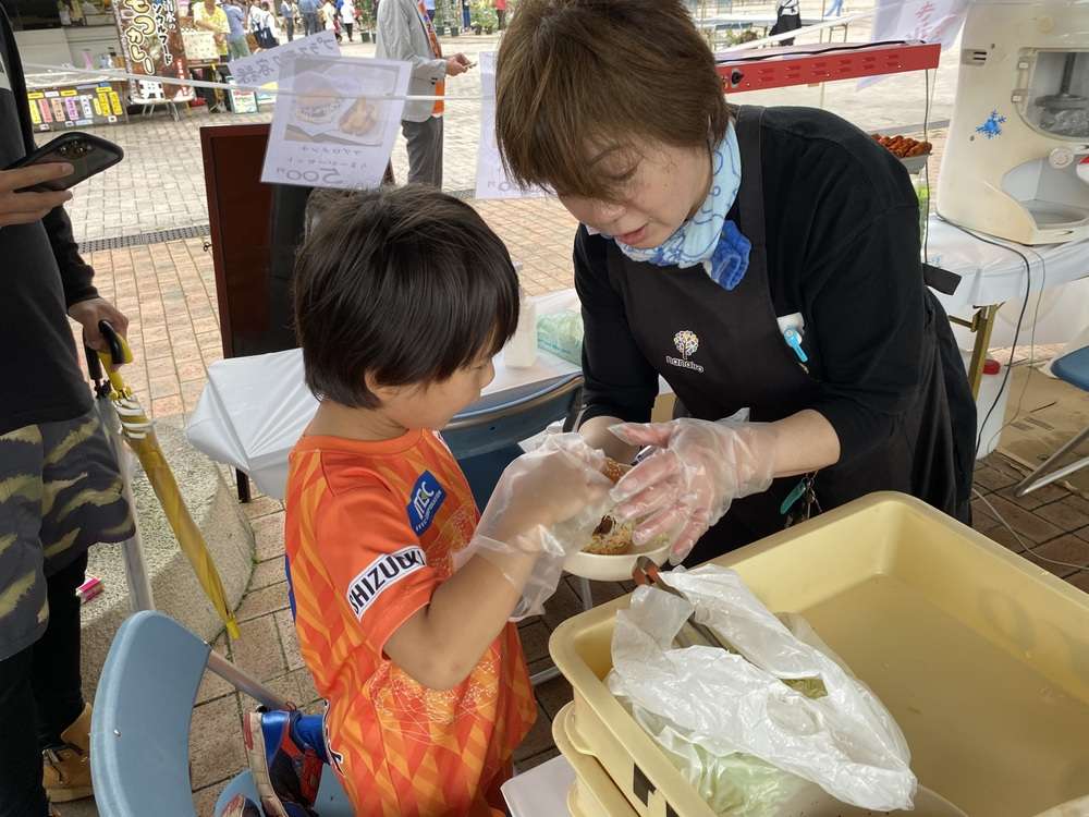 当日午前、エスパルスダンススクールの皆さんが販売のお手伝いやバガス容器の回収のお仕事を体験しながら、環境問題について実体験と共に啓発活動にも参加しました。午後はあいにくの雨となりましたが、サッカースクール生にはマグロメンチカツバーガーの製造調理を体験いただきました!
