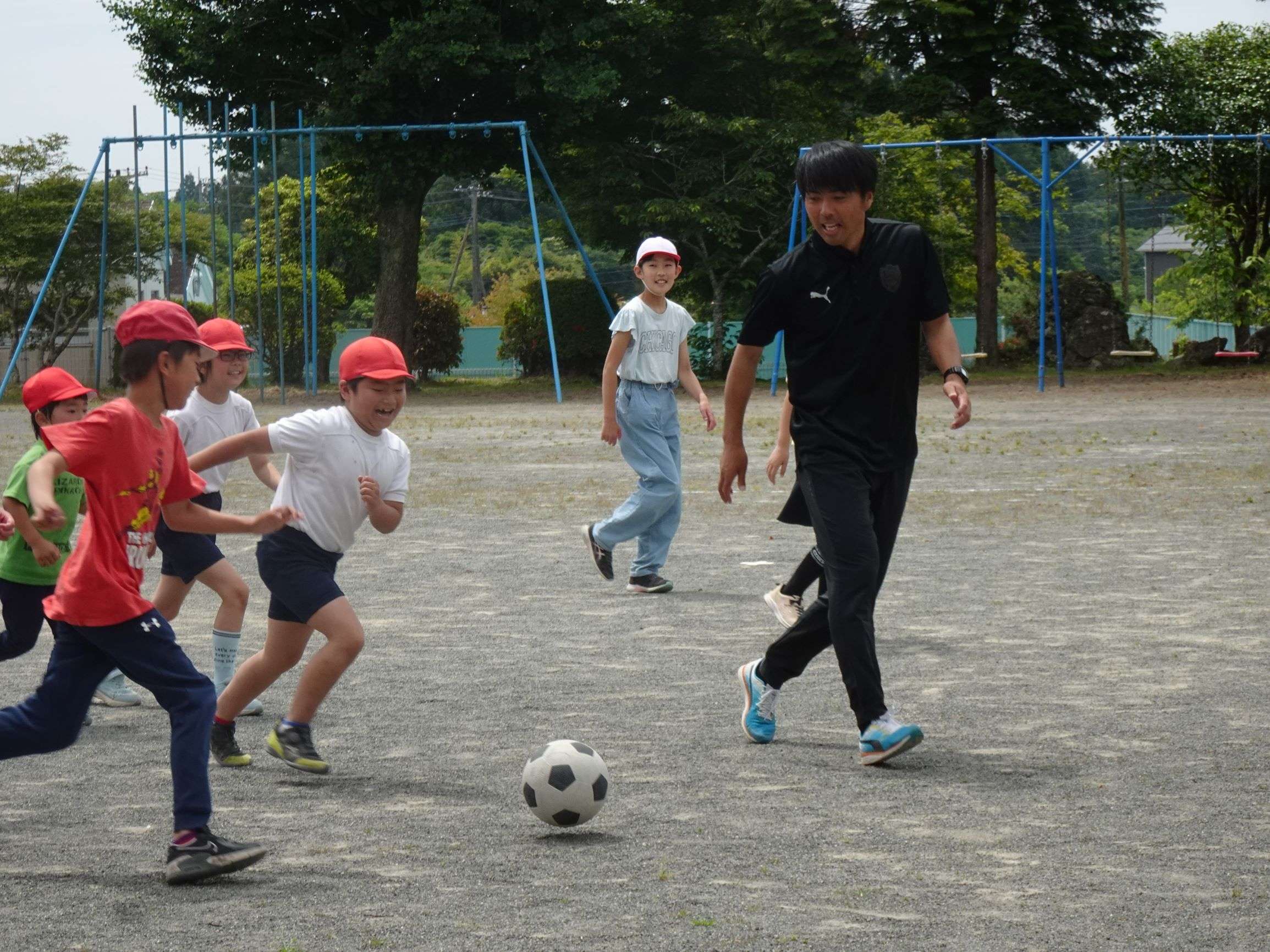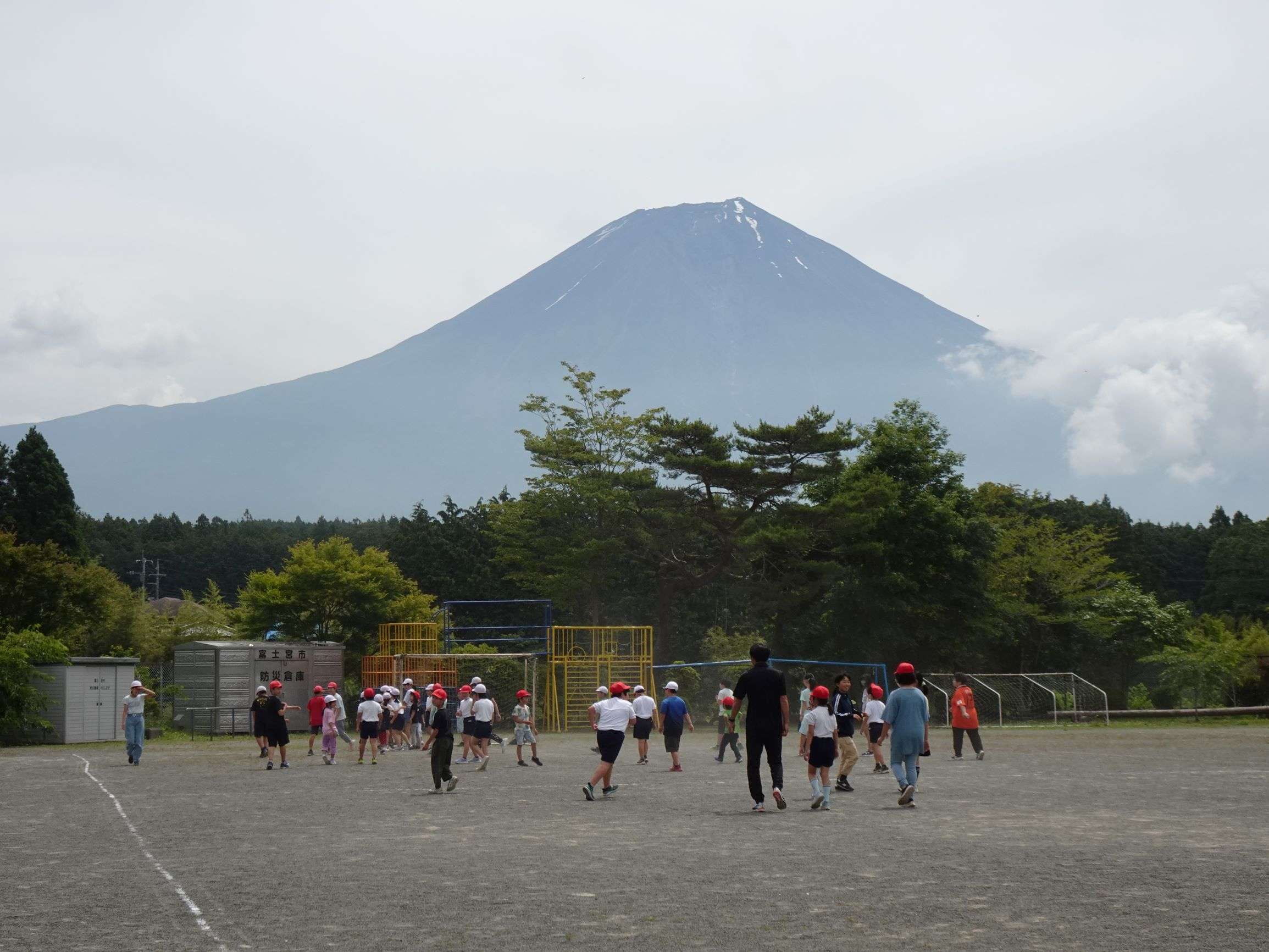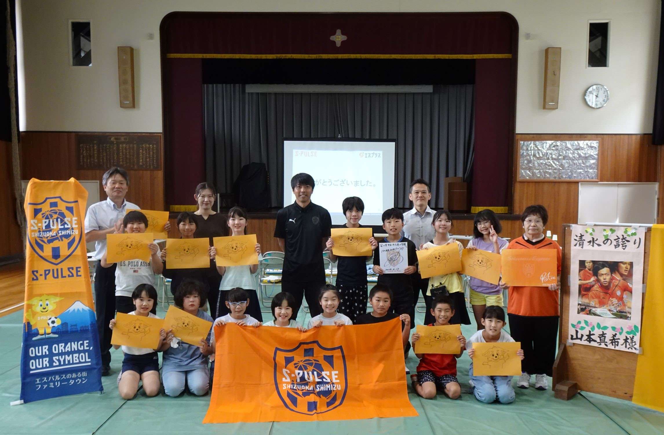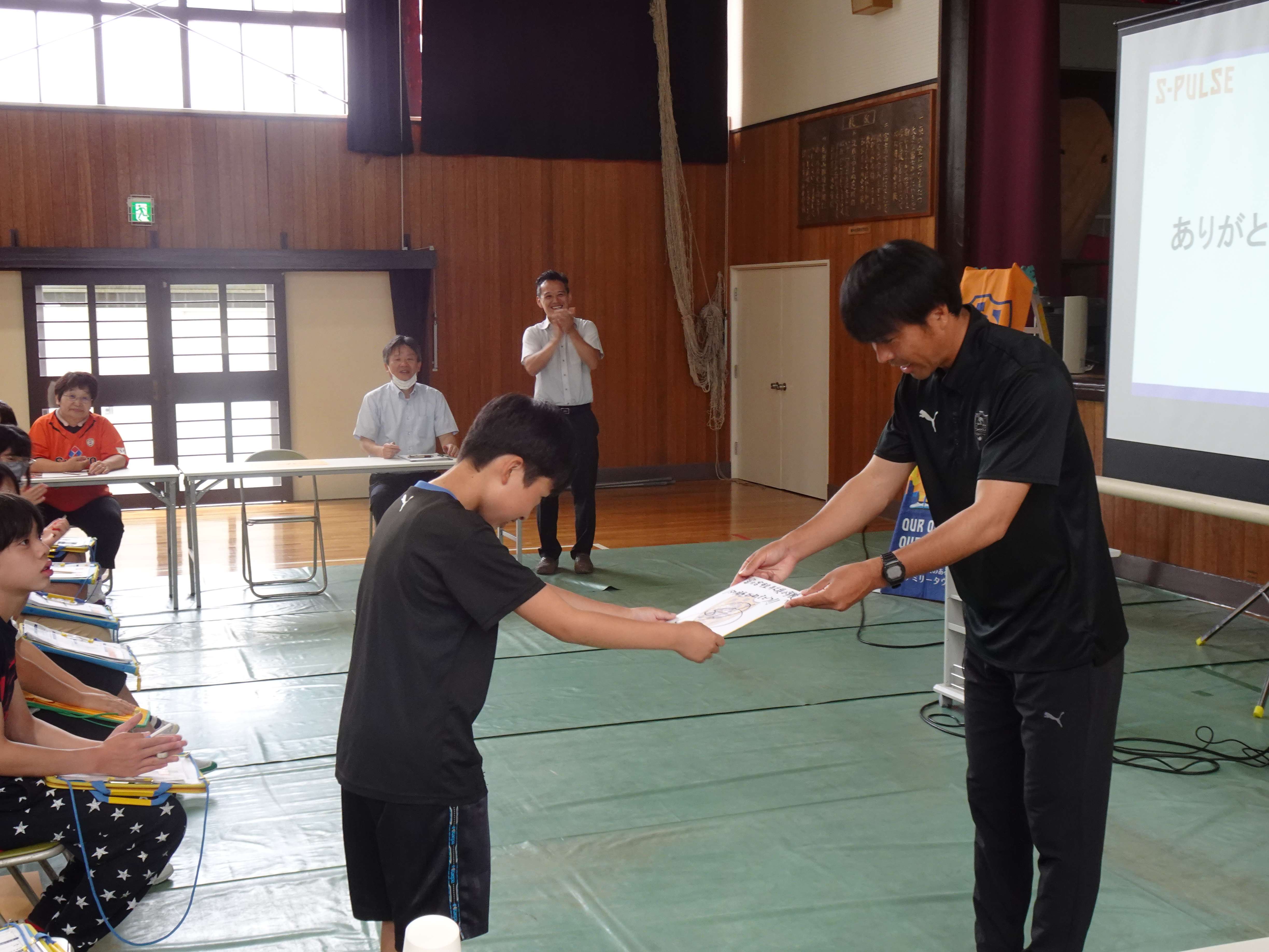 授業の最後には、代表の児童が感想とお礼の言葉を述べ、山本からはサインが贈呈されました。昔からエスパルスの熱狂的なファンだと話す先生方も入って、記念撮影を行ったあとは、富士山が映えるグラウンドに出て、なんと全校児童と一緒にサッカーを行いました。全校生徒が2チームに分かれ、ボールを追ってかけまわり、ゴールにはたくさんの児童が壁となり、点を入れるのが難しいサッカーでしたが、笑顔溢れるひとときとなりました。