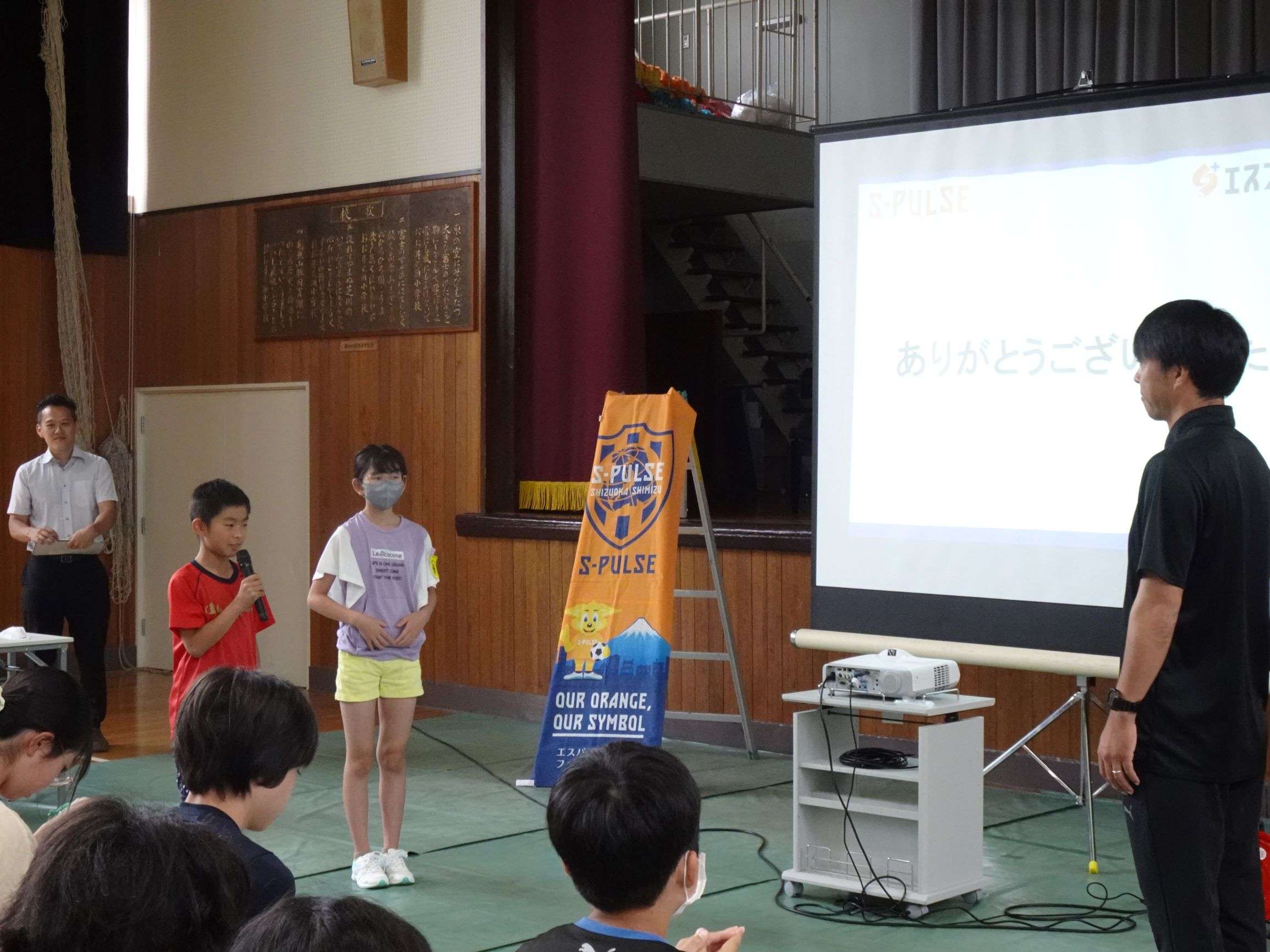 授業はエスパルスの簡単なクイズからスタート。エスパルスの「S」の意味や、マスコットの名前などを、大きな声で答えてくれました。