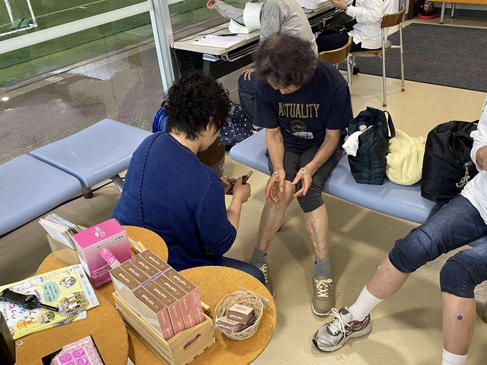家庭用のセルフケア商品「こりスポッと」を使って、コリが気になる部位のツボに貼る「ツボ刺激体験」。丸いシールに小さな樹脂の粒が付いており、鍼のように刺さったりしないタイプなので、金属アレルギーの方や、鍼が苦手な方にも抵抗なく体験いただくことができます。また、新潟県産の上質なもぐさを使用したお灸「台座灸ヨモニコ」体験も可能です。参加者の皆さんは、それぞれコリが気になる部位に、運動の前や後に「ツボ刺激」体験をしていただき、セイリンの鍼灸商品の効果を実感いただけます。