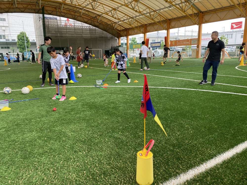 SDFのピッチ内に特設コースをご用意!1ホールから9ホールまで周回いただき、その後は時間内自由にフットゴルフを楽しんでいただきました。