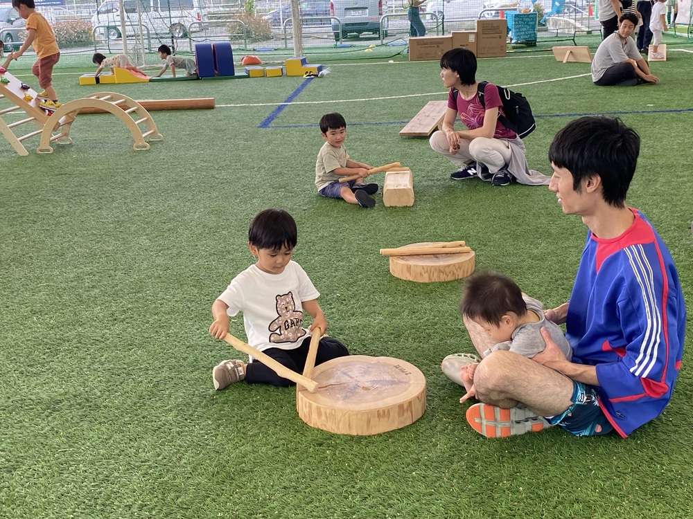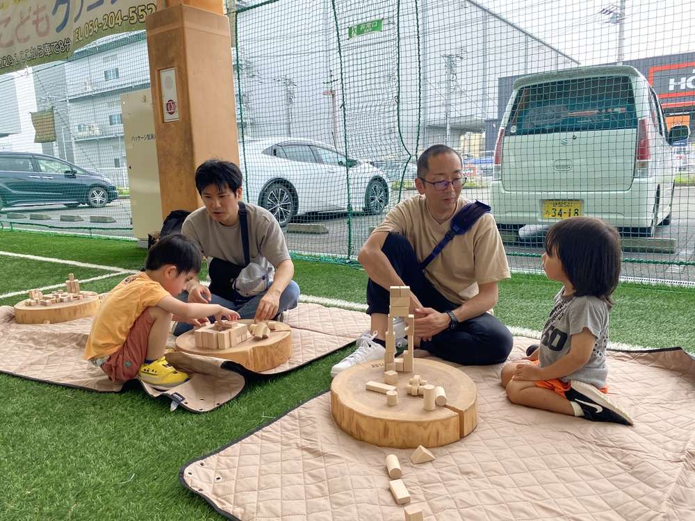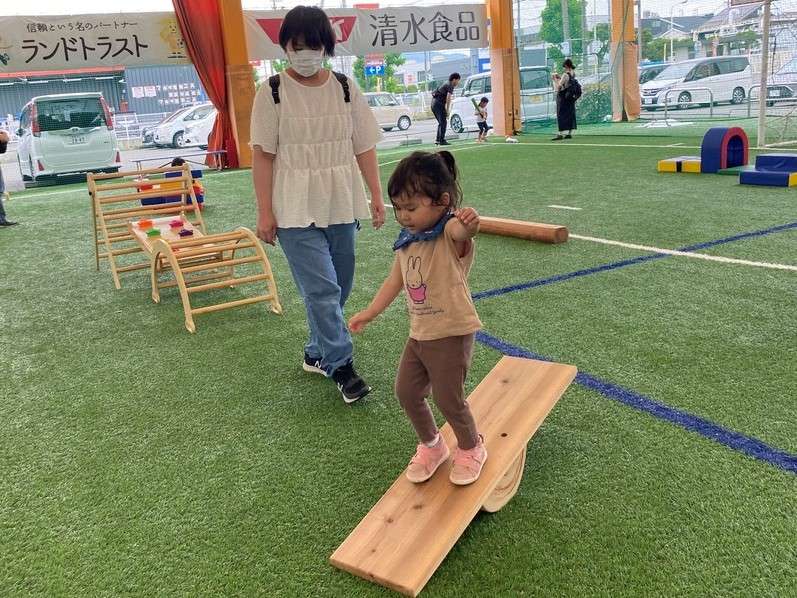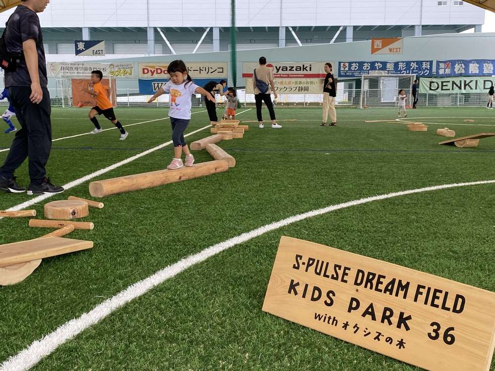 KIDS PARK36は、幼少期から養っておきたい人間の基本的な動き(36の基本動作)を遊びながら自然と身につけられる遊び場です。会場となるエスパルスドリームフィールドが、静岡市の中山間地域「オクシズ」の木を使って制作した遊具、ジャングルジムや自転車、積み木などなど様々な遊具で遊んでいただける公園で自由遊びを楽しんでいただきました。