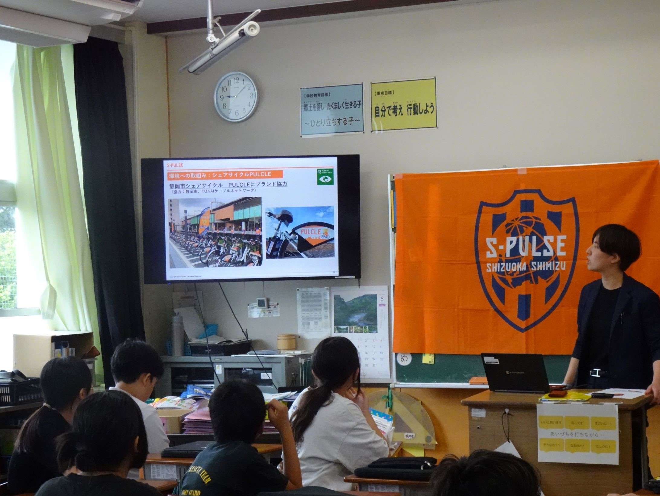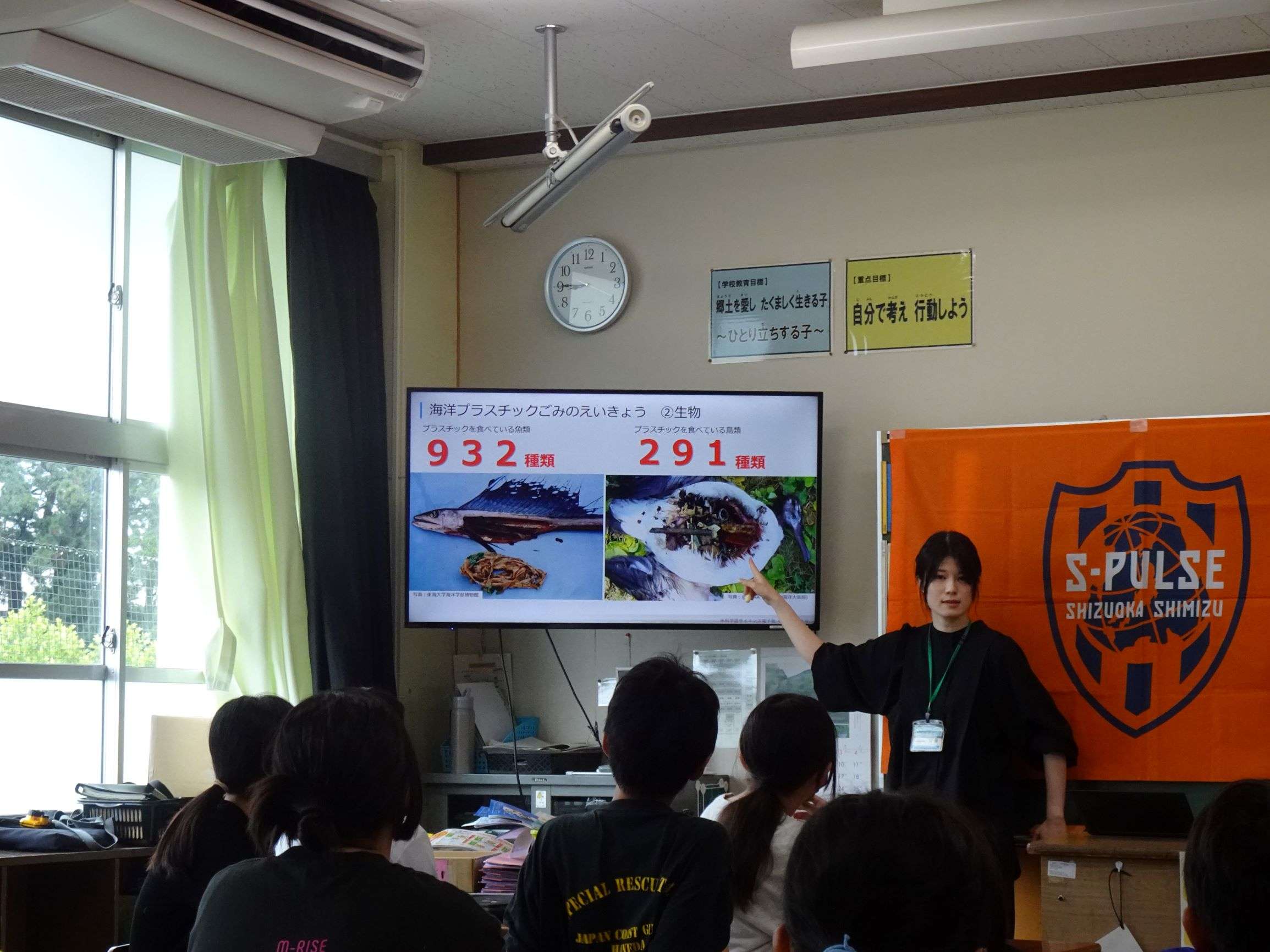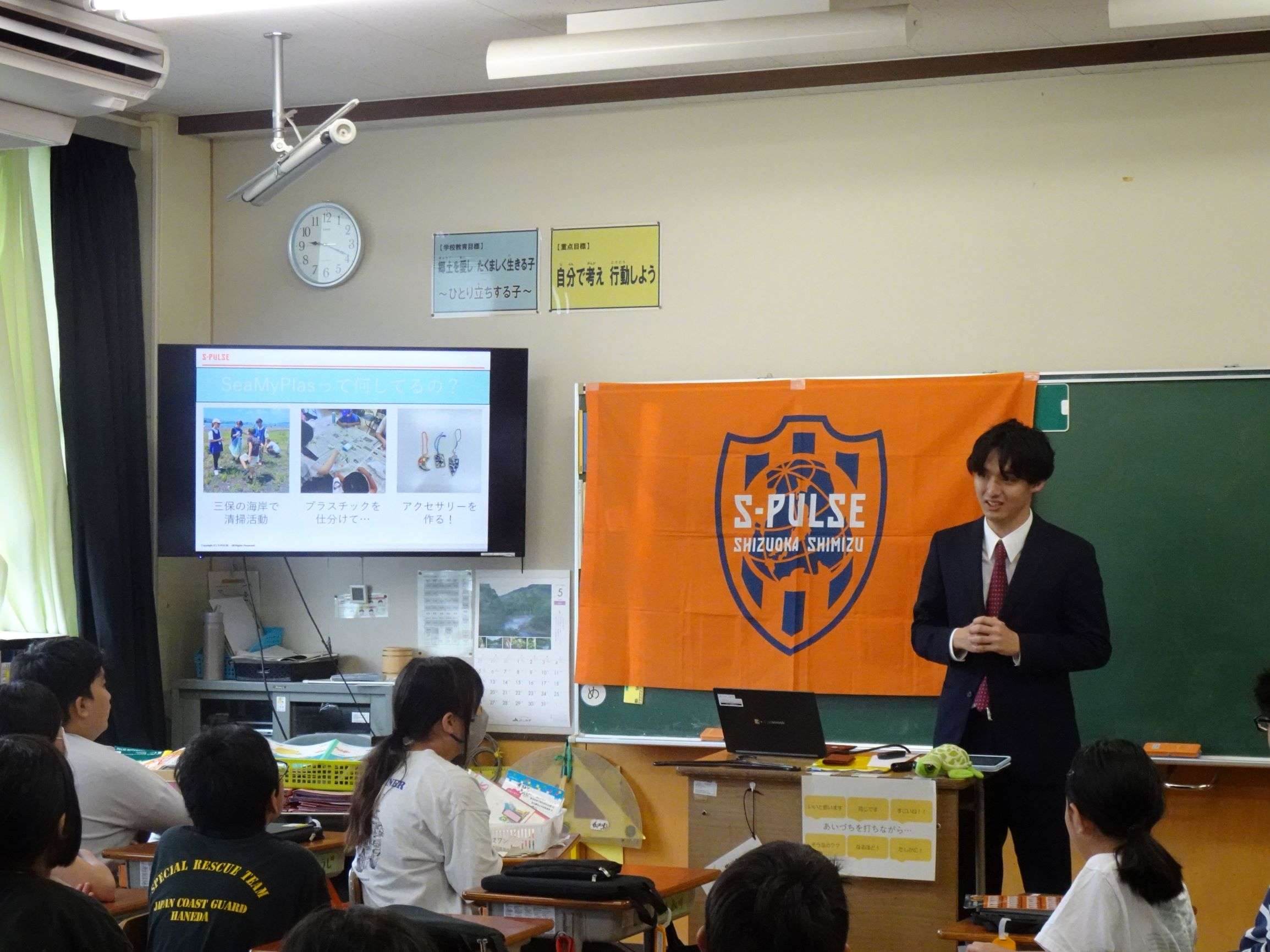 5/31(金)に静岡市立清水三保第二小学校にて小学6年生を対象に『静岡の海を守るために~三保海浜のプラスチックごみ削減~』静岡市 環境出前授業が行われ、(株)エスパルス ホームタウン事業部のスタッフが参加しました。