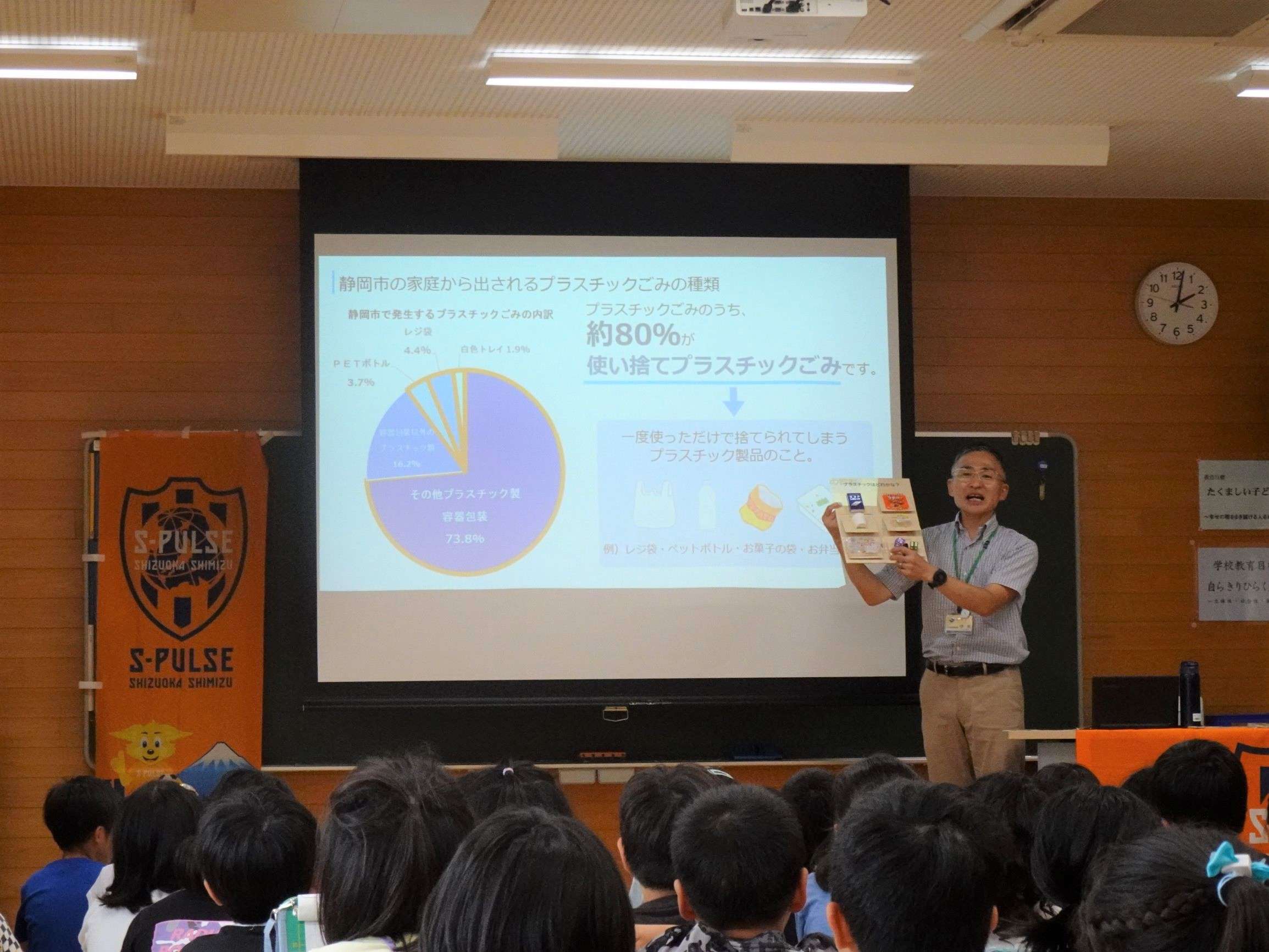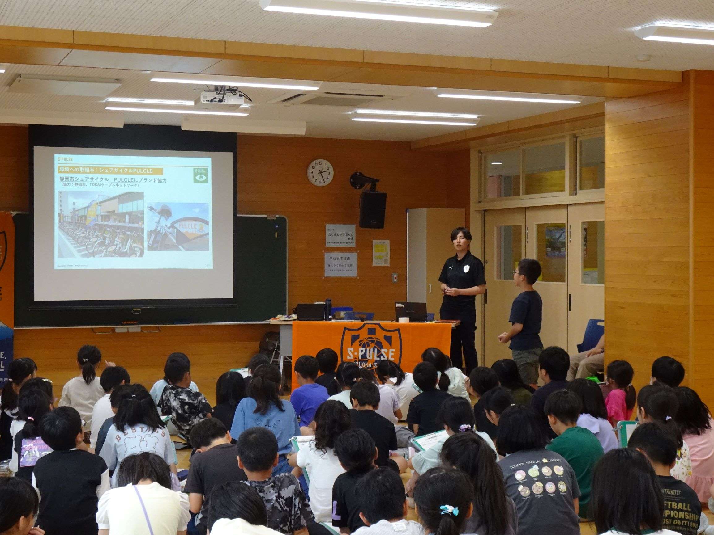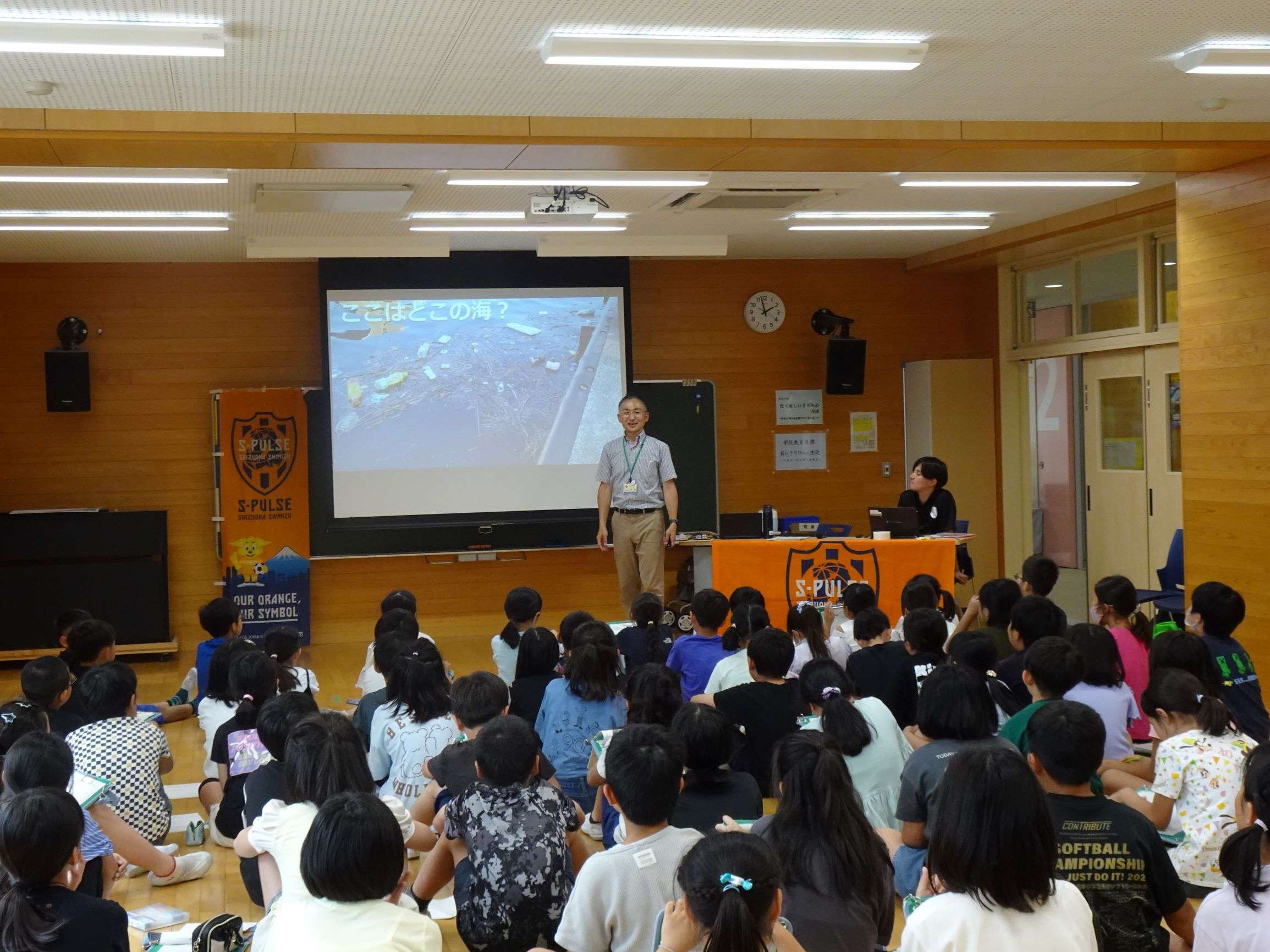6/27(木)に静岡市立森下小学校にて小学4年生を対象に『静岡の海を守るために』をテーマにした環境授業が行われ、(株)エスパルス ホームタウン事業部のスタッフが参加しました。