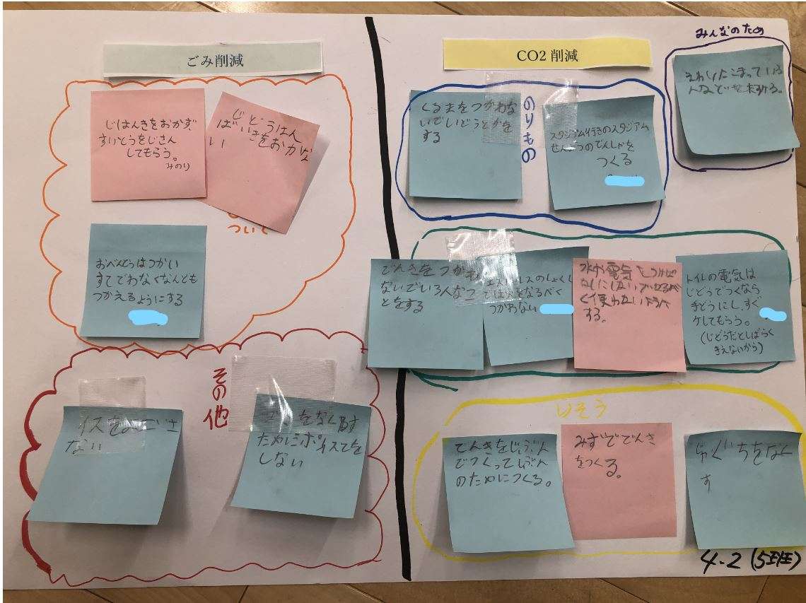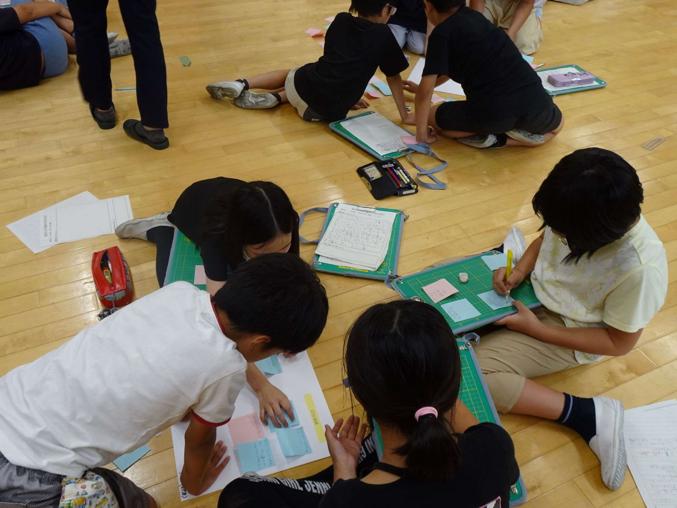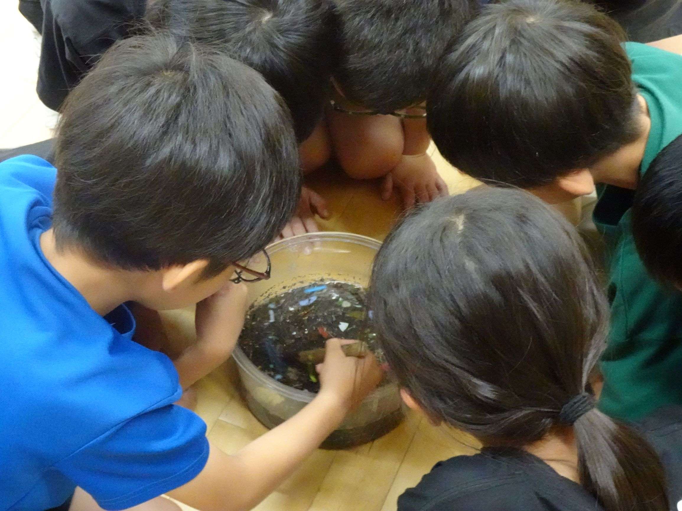 「マイバックやマイ水筒を使う」「トイレの水を流しすぎない」など、自分たちにできることを積極的に話し合いました。ほかにも「専用の電車(駅)をつくる」「スタジアムのイスはプラスチックだから、壊さないように丁寧に使う」などユニークなアイデアもでました。子どもたちは、さまざまな視点から、本当にたくさんの取り組みを考えてくれました。最後に、マイクロプラスチックの観察を行い、今日学んだことを、実際に生活で意識して取り入れていくこと、この後の社会の学習につなげていくことを確認し、授業を終えました。