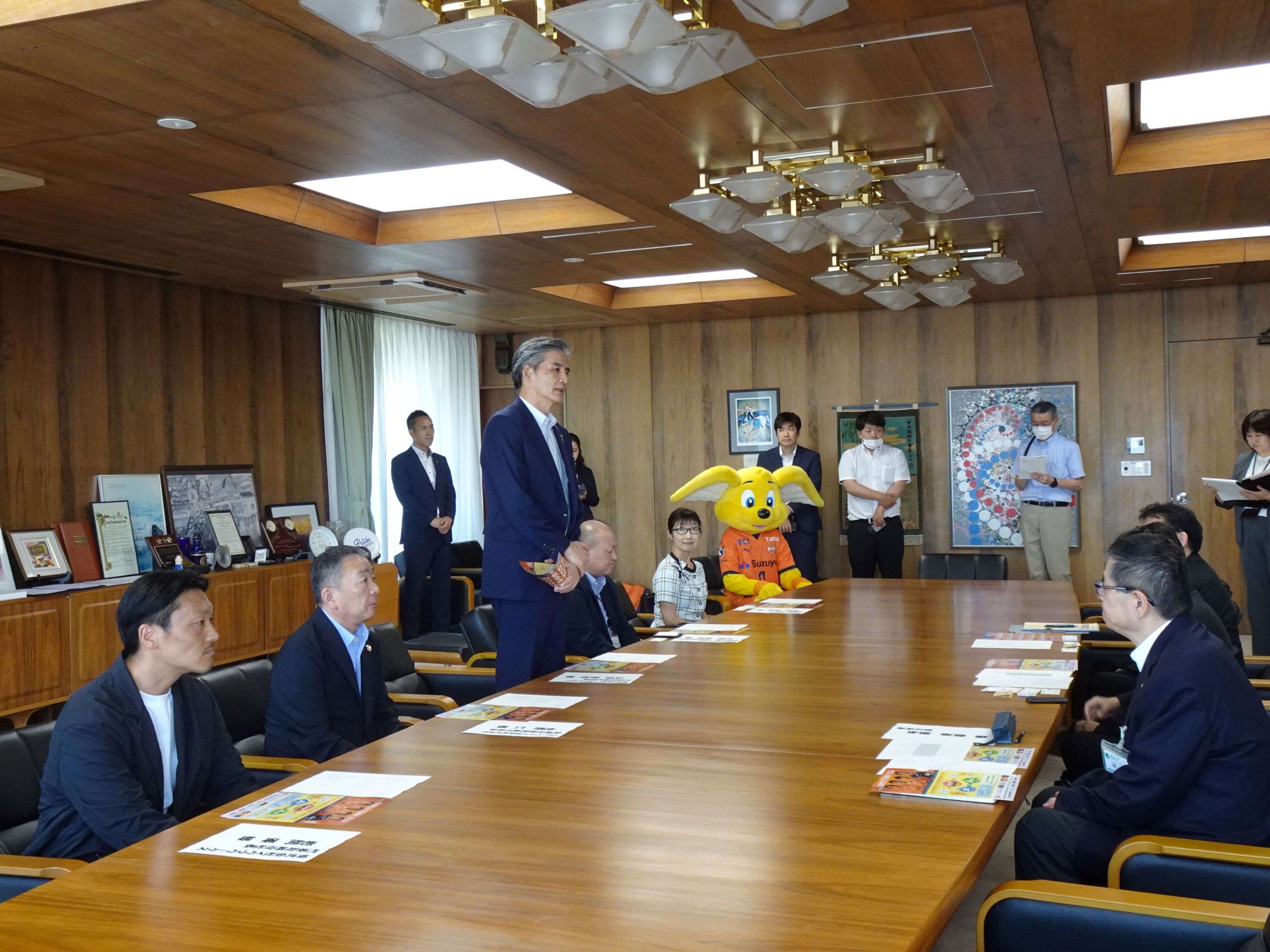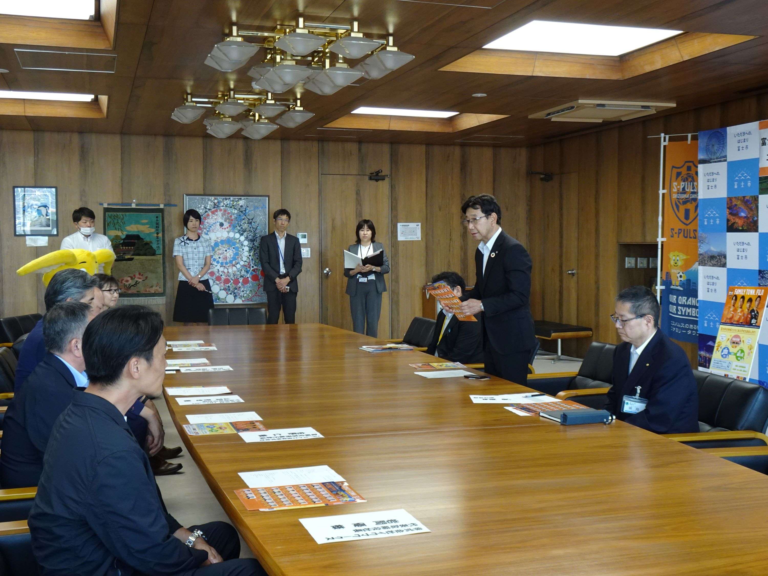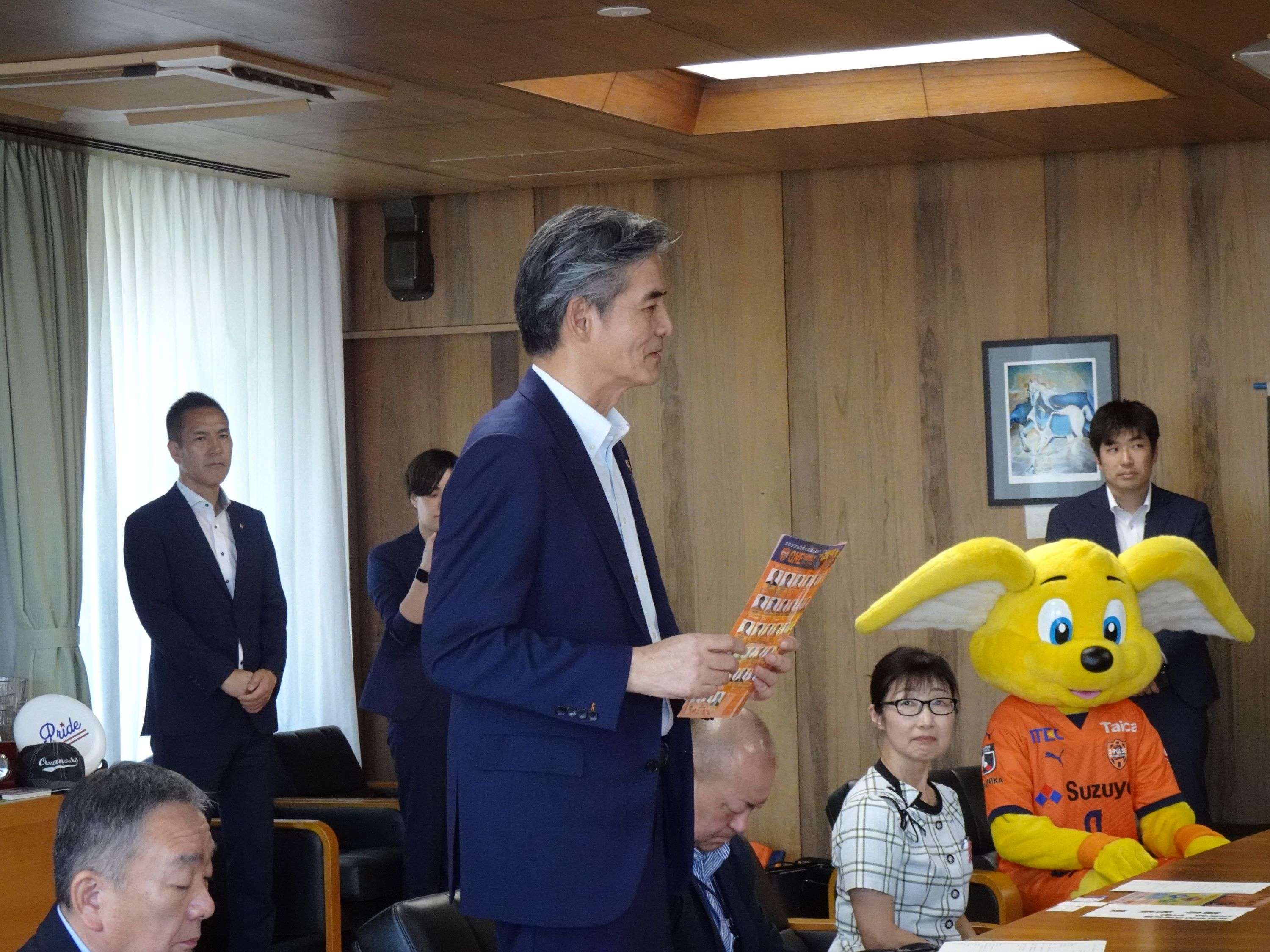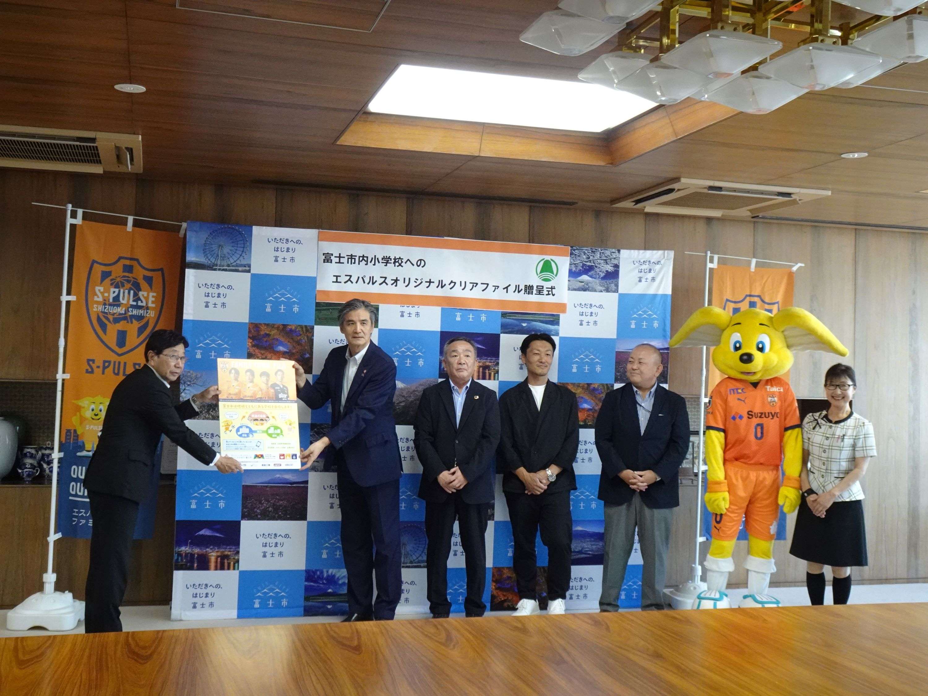7/5(金)富士市役所にてクリアファイルの贈呈式を実施し、株式会社エスパルス 代表取締役社長 山室晋也とオフィシャルマスコットのパルちゃんが参加しました。贈呈式にはご協賛いただいた企業の代表者様にもご出席いただき、富士市 森田嘉幸教育長へ贈呈を行いました。