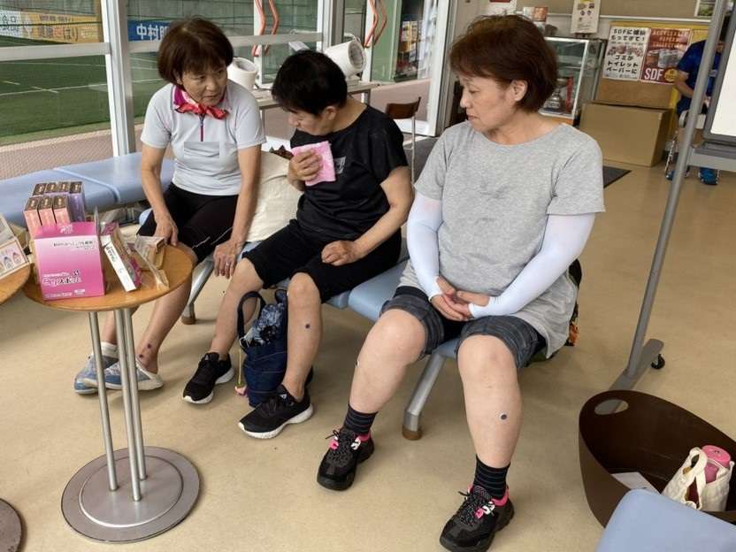 家庭用のセルフケア商品「こりスポッと」を使って、コリが気になる部位のツボに貼る「ツボ刺激体験」。丸いシールに小さな樹脂の粒が付いており、鍼のように刺さったりしないタイプなので、金属アレルギーの方や、鍼が苦手な方にも抵抗なく体験いただくことができます。また、新潟県産の上質なもぐさを使用したお灸「台座灸ヨモニコ」体験も可能です。参加者の皆さんは、それぞれコリが気になる部位に、運動の前や後に「ツボ刺激」体験をしていただき、セイリンの鍼灸商品の効果を実感いただけます。